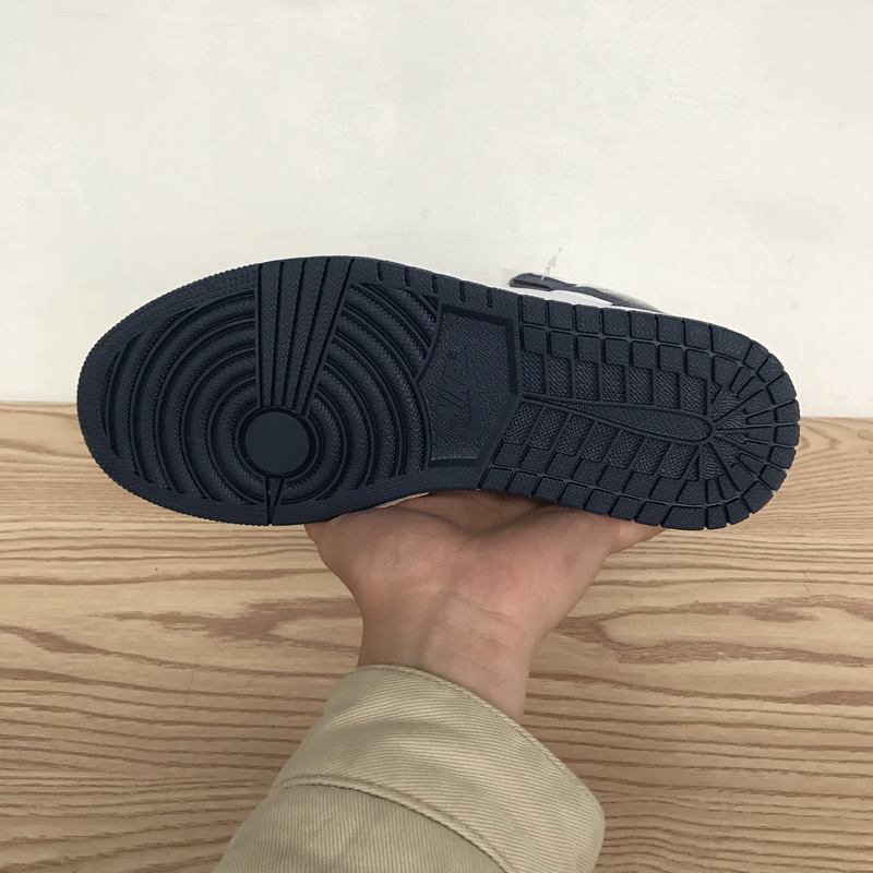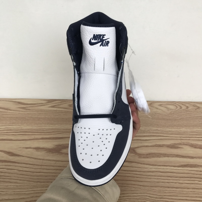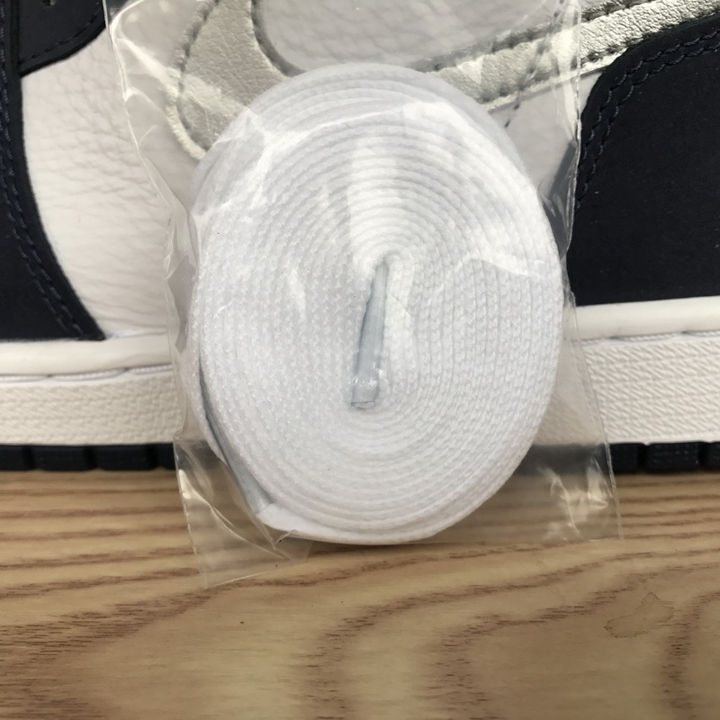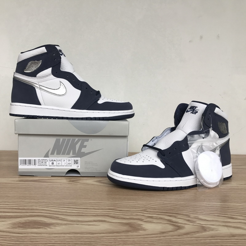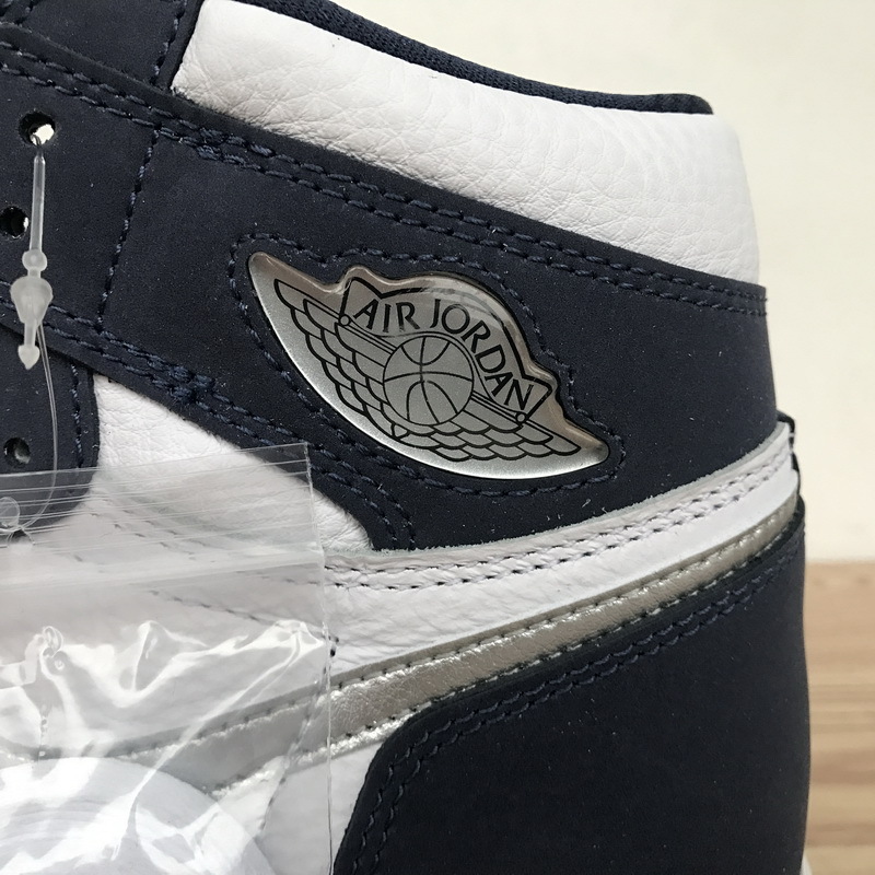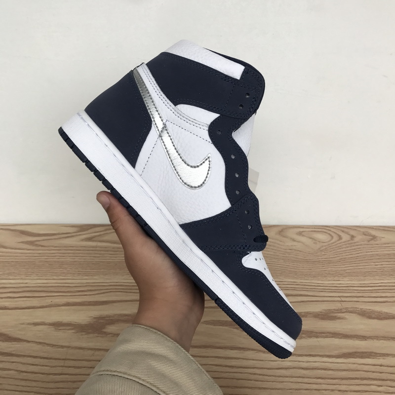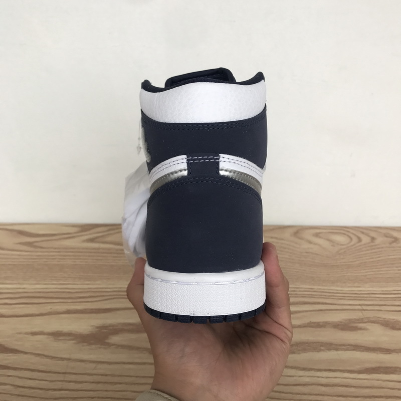 Product description:Dressed in a White, Midnight Navy, and Metallic Silver color scheme. This Air Jordan 1 looks similar to the original pair featuring a White leather upper with Navy overlays, Silver Swooshes and Wings logo. A White midsole atop a Navy rubber outsole completes the design.
