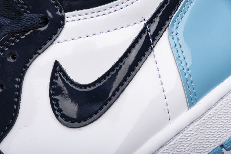 Product description:This Air Jordan 1 features a full patent leather upper in a mix of Obsidian, Blue, and White. Nike Air tongue tags, Wings logo on the ankle atop a White midsole and Light Blue outsole completes the design.