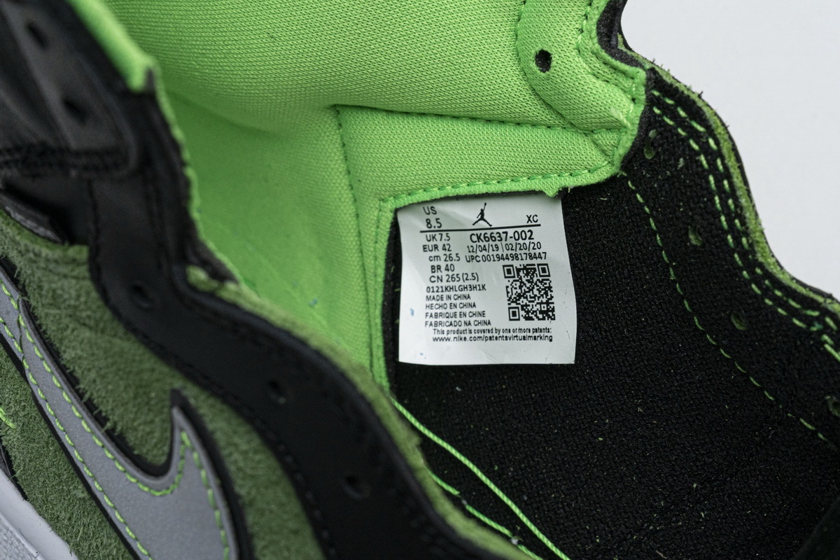 Product description:Dressed in a similar color blocking as 2007’s “Brut” SB Dunk High. This offering of the Air Jordan 1 Zoom sports Green hairy suede on the toe and side panel with Black smooth leather overlays. Green liner, 3M reflective Swooshes, Zoom tag on the lateral side atop a White midsole and icy translucent outsole completes the design