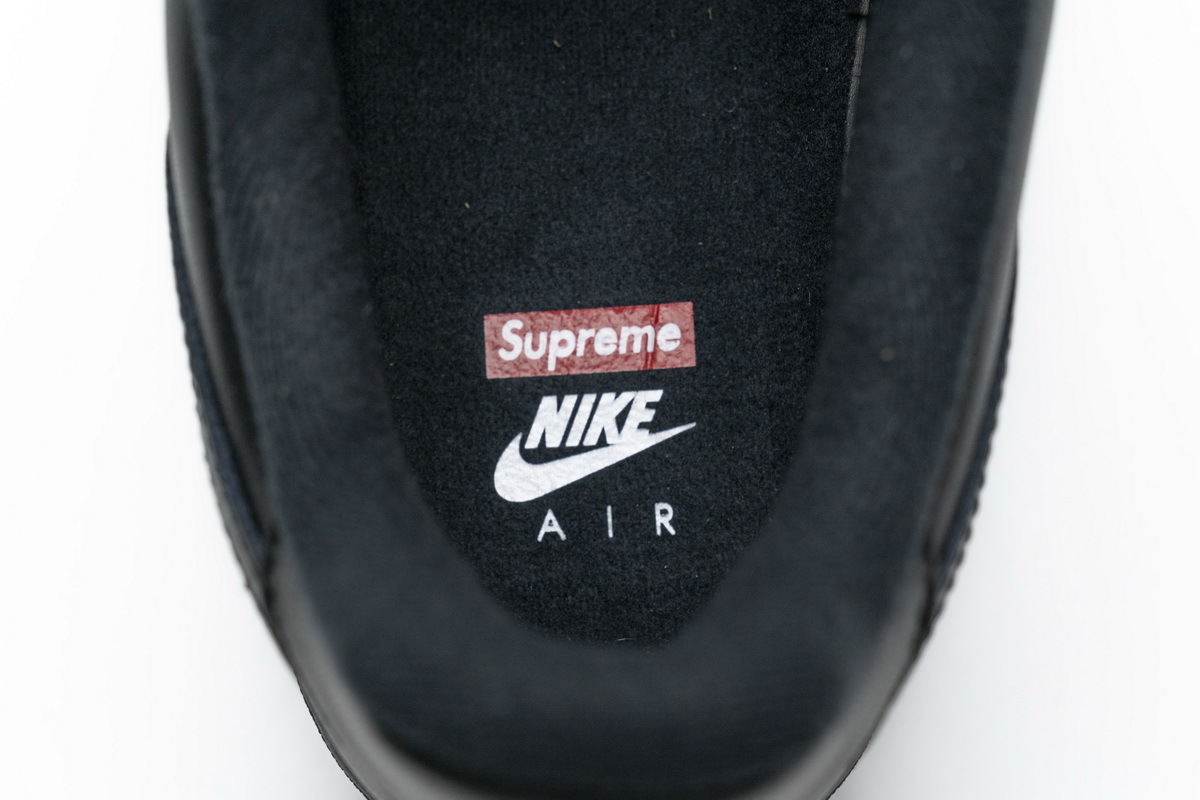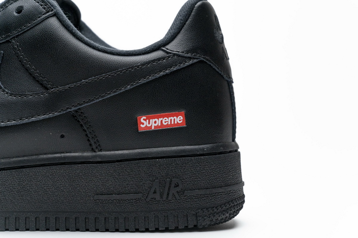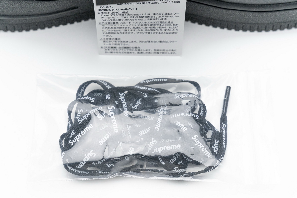 Product description: This Air Force 1 Low is comprised of an all-black leather upper with matching soles and detailing. A red Supreme Box Logo placed on the outside heel and alternate branded 3M laces complete the design.