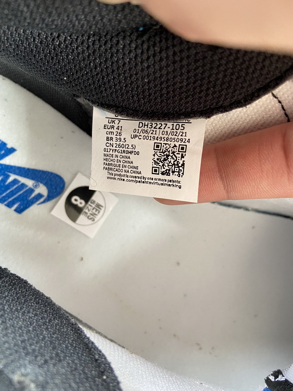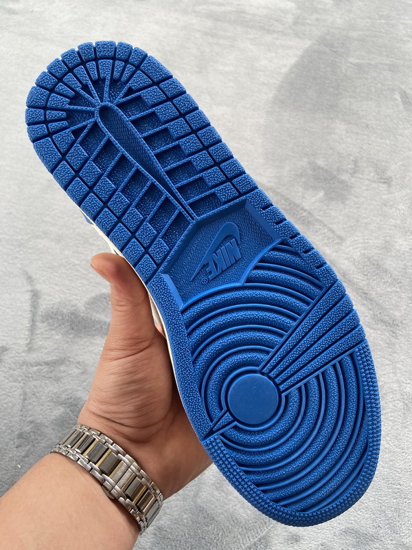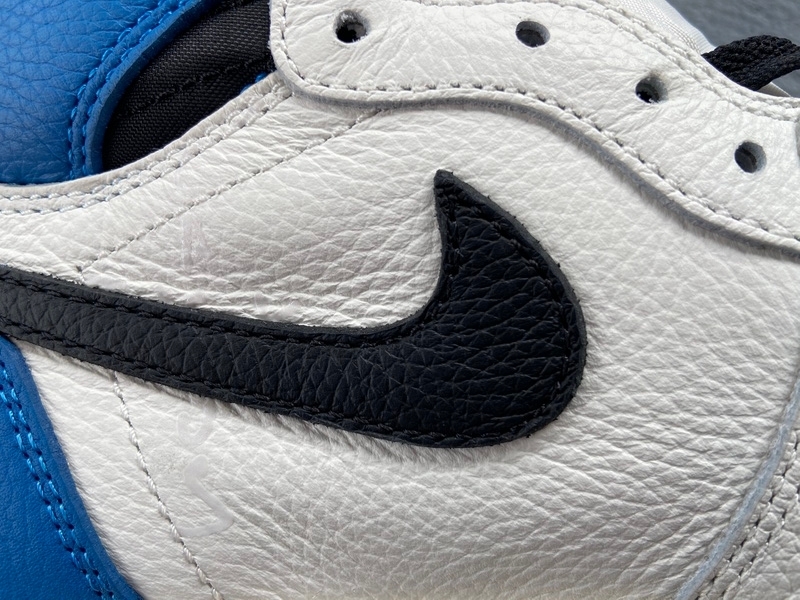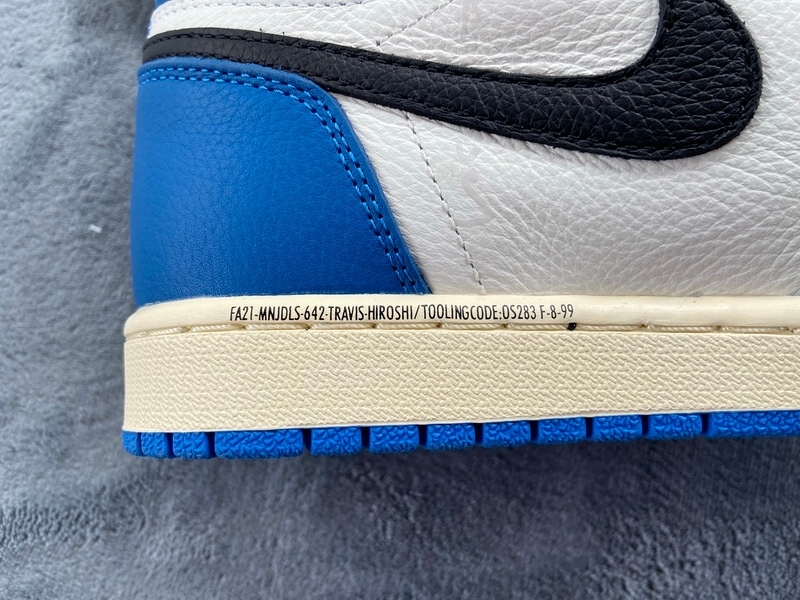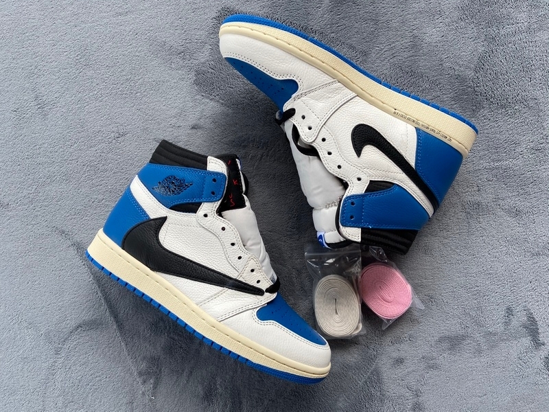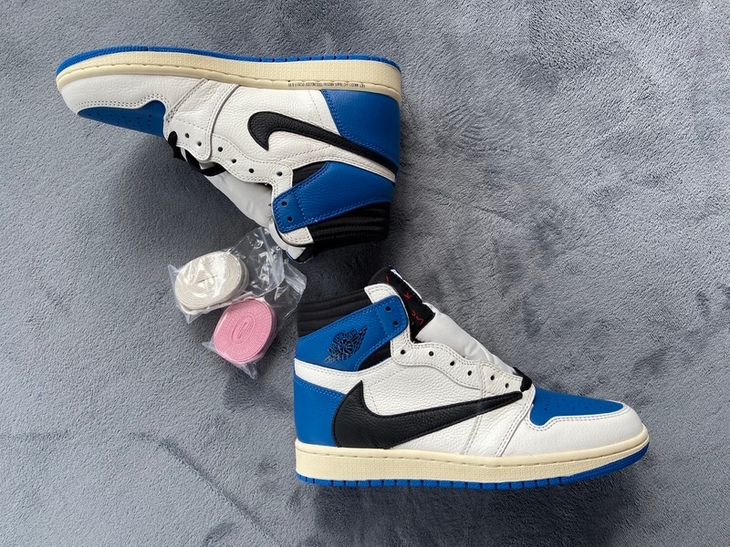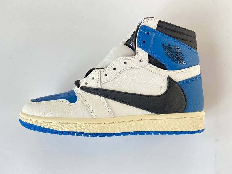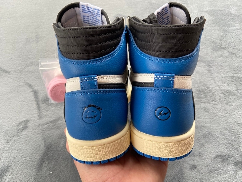 Product description: Dressed in a Sail, Black, Military Blue, and Shy Pink color scheme. This Air Jordan 1 High features a White leather upper with a Blue toe box, ankle flaps, heels, and rubber outsole while having Travis’ signature flipped Black Swooshes on the sides. “Cactus Jack” branding on the tongue and a stitched up smiley face on the left heel, while Hiroshi Fujiwara’s double lightning bolt motif can be seen on the right completes the design.