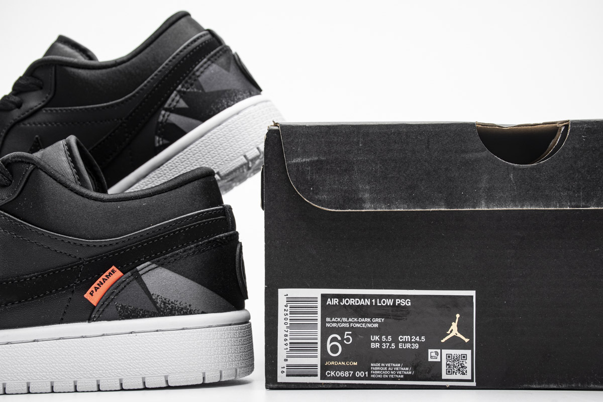 Product description: Dressed in a Black, Infrared 23, and White color scheme. The low-top Air Jordan 1 Low features an all-Black upper with “PANAME” tag stitched on the rear with the “PSG” medallion on the back heels. Printed “Paris” tongues and branded insoles completed with a White rubber sole completes the design.