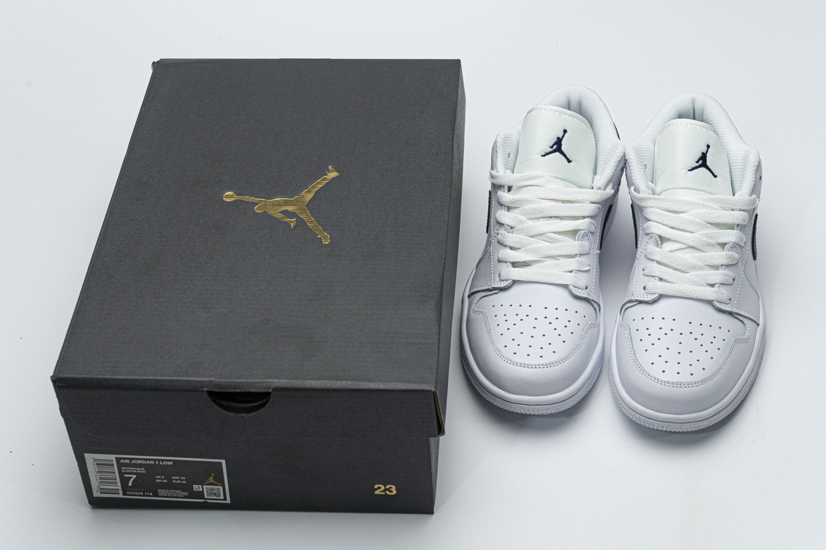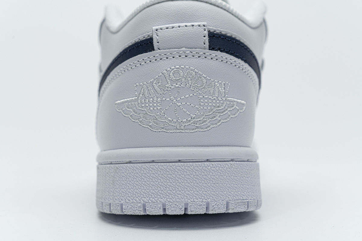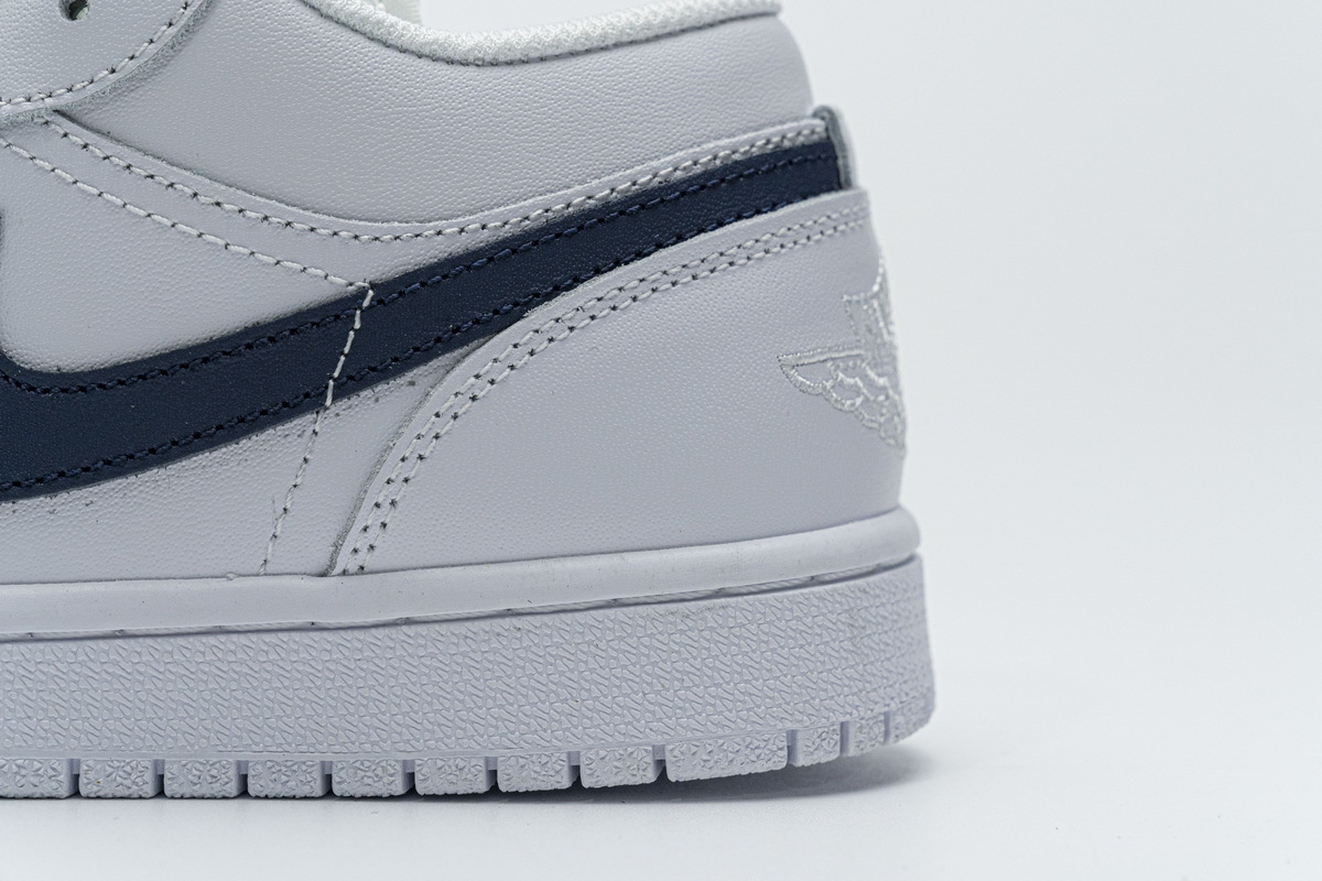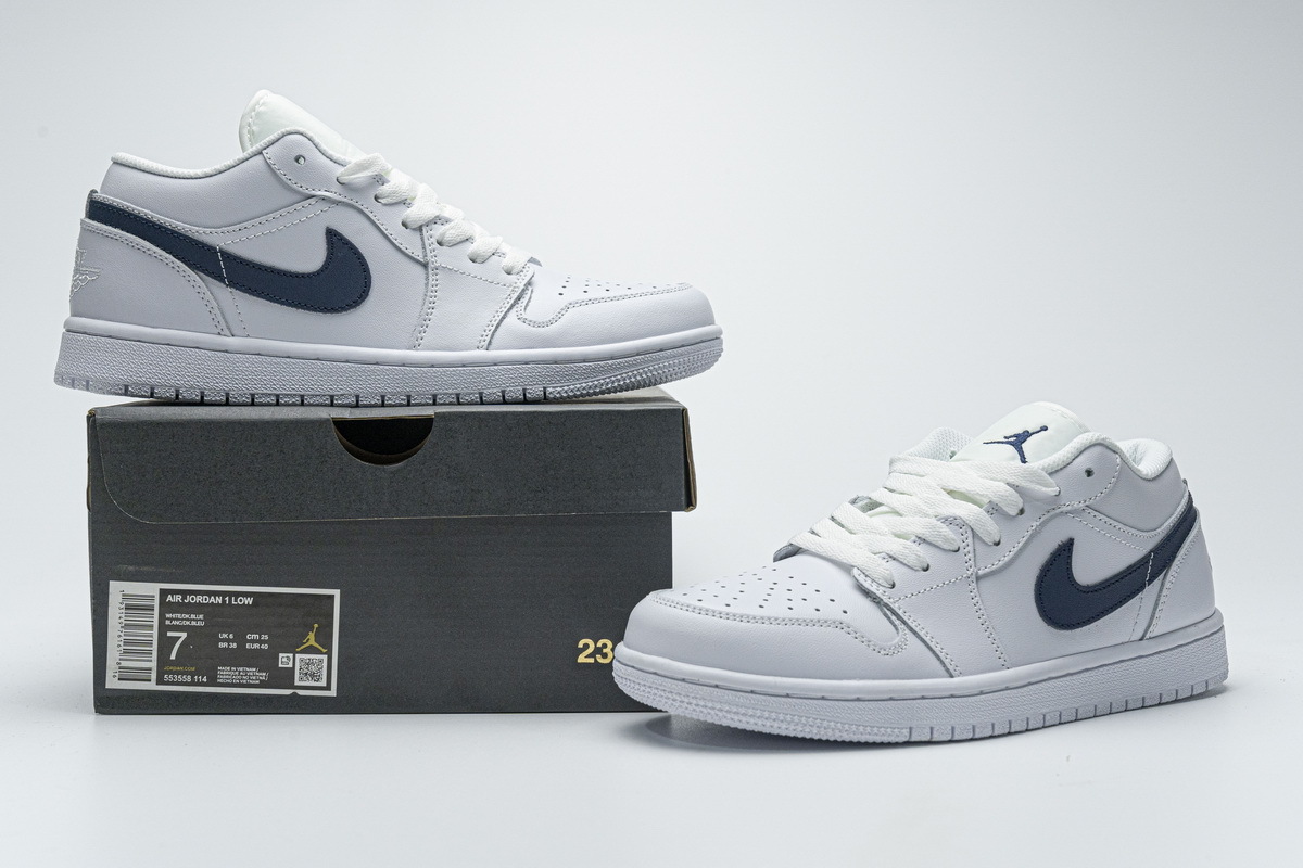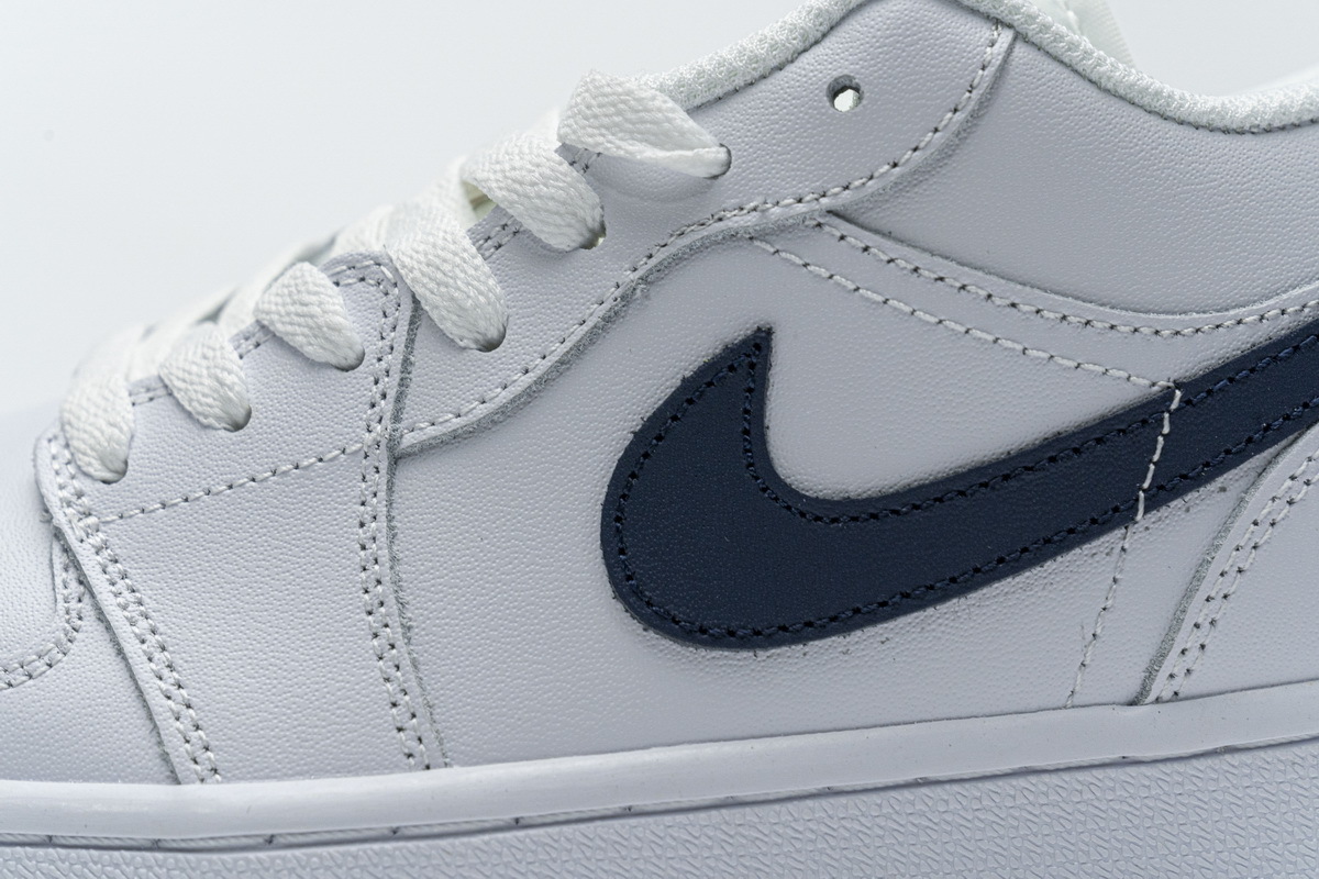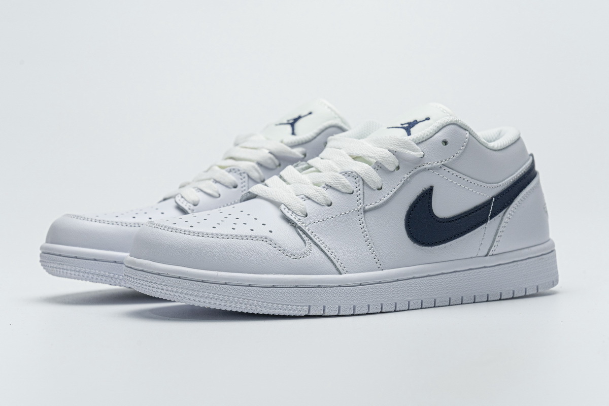 Product description: This offering of the low-top Air Jordan 1 Low features a White leather upper with an Obsidian tumbled leather Swoosh on the sides. The same color is also used on the tongues and insole completed with an all-White rubber sole.