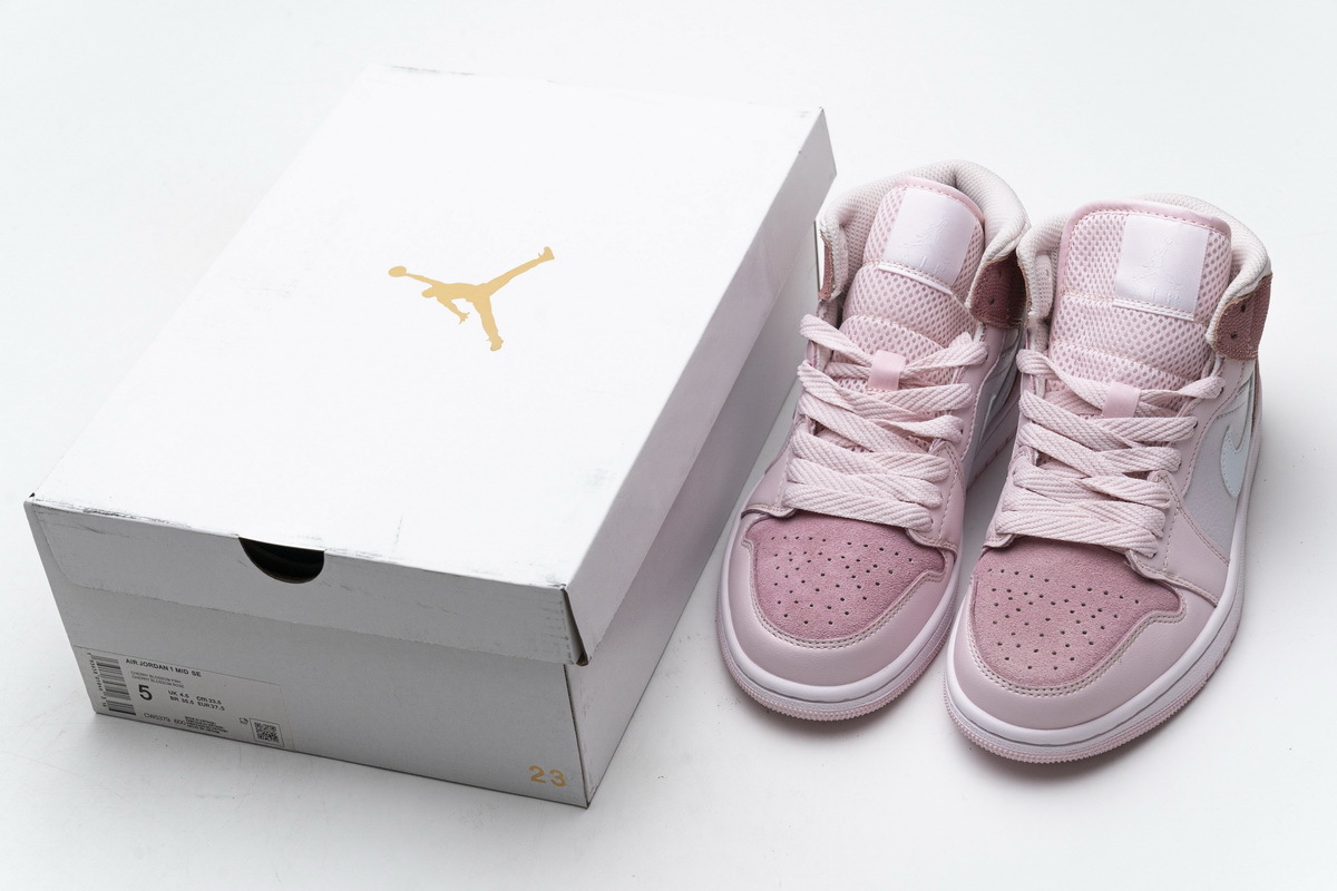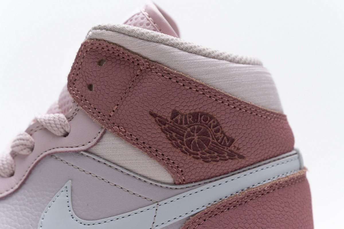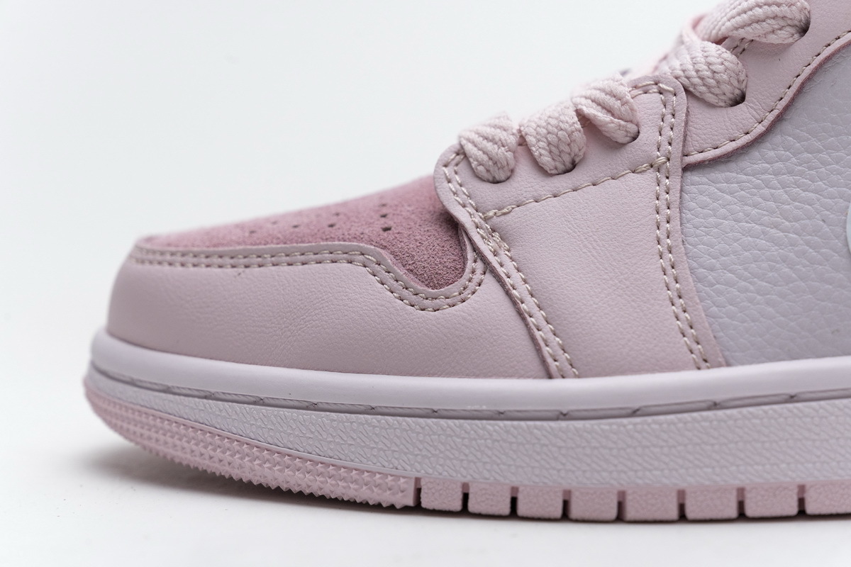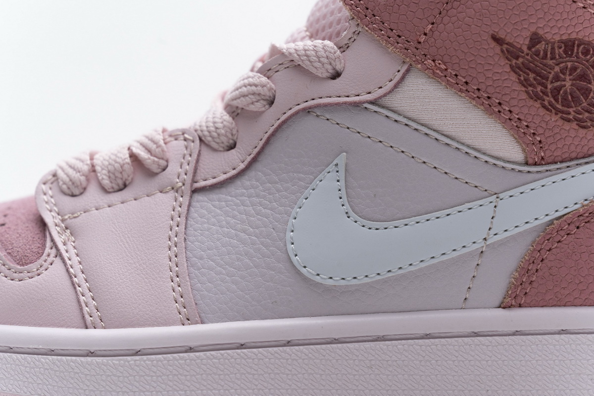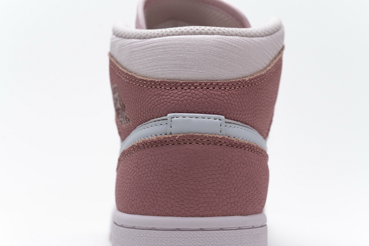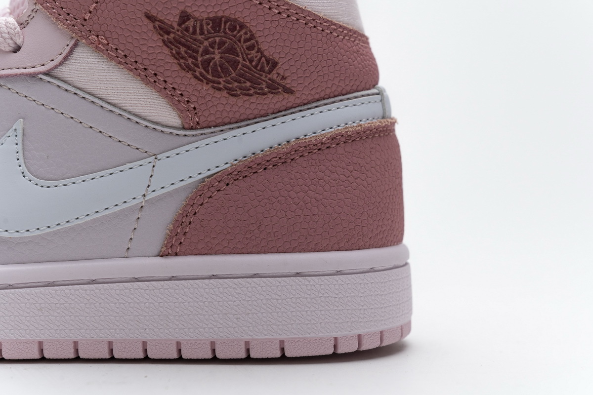 Product description:This offering of the mid-top Air Jordan 1 features a suede toe box, smooth leather overlays, silky ankle collar, and basketball-textured leather covering the collar and heel overlays. Finishing off the design is a Sail midsole and Pink rubber outsole.