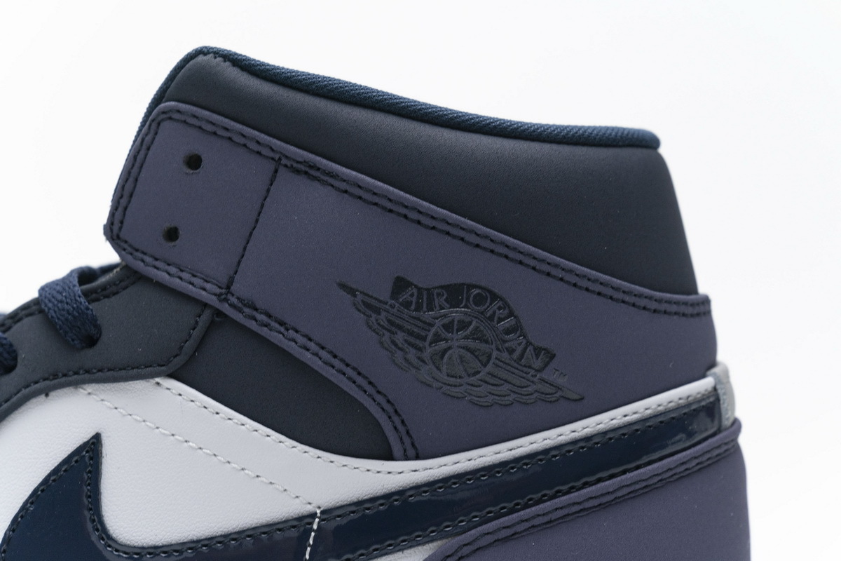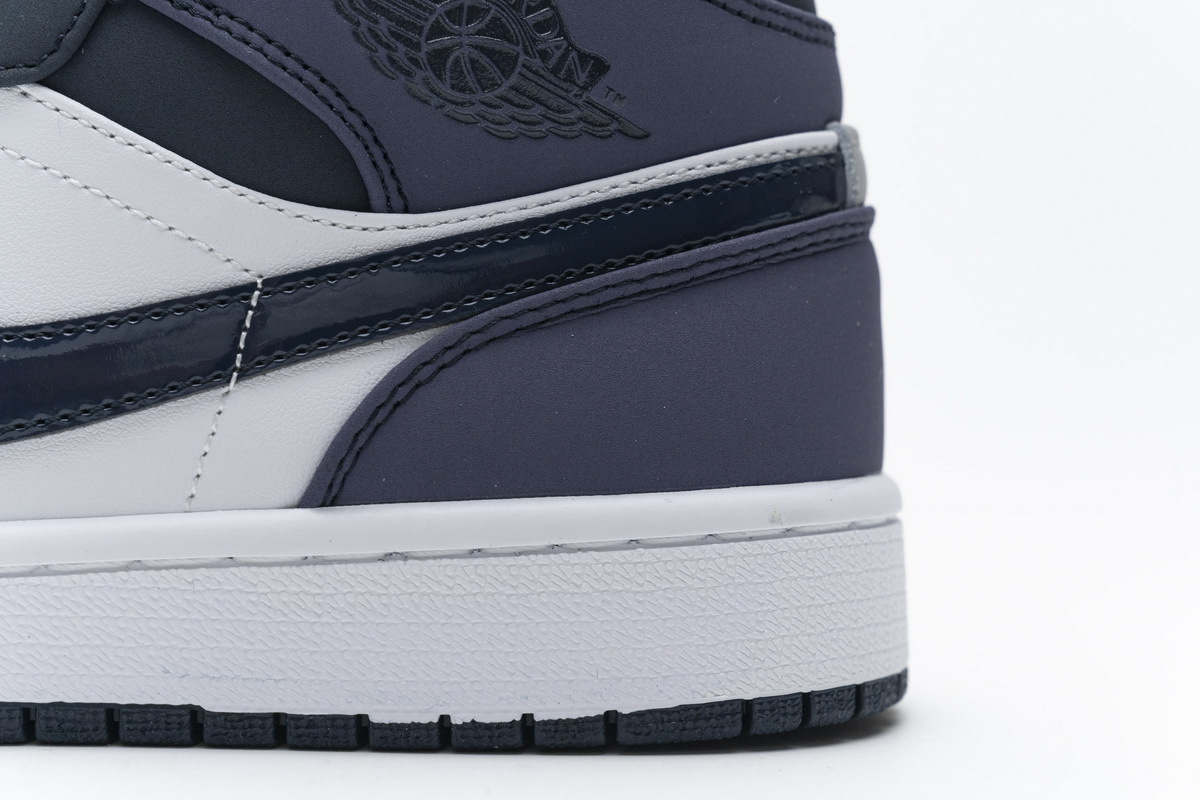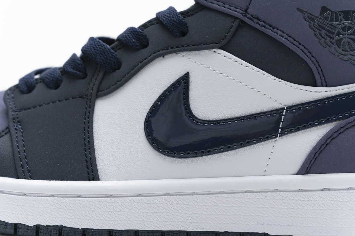 Product description:Dressed in an Obsidian, Sanded Purple, and White color scheme. This mid-top Air Jordan 1 features an Obsidian overlay on the throat, patent leather Swoosh, tongue, and outsole, while White covers the side panels and midsole. Sanded Purple is used on the toe box, collar, and heel to complete the design.