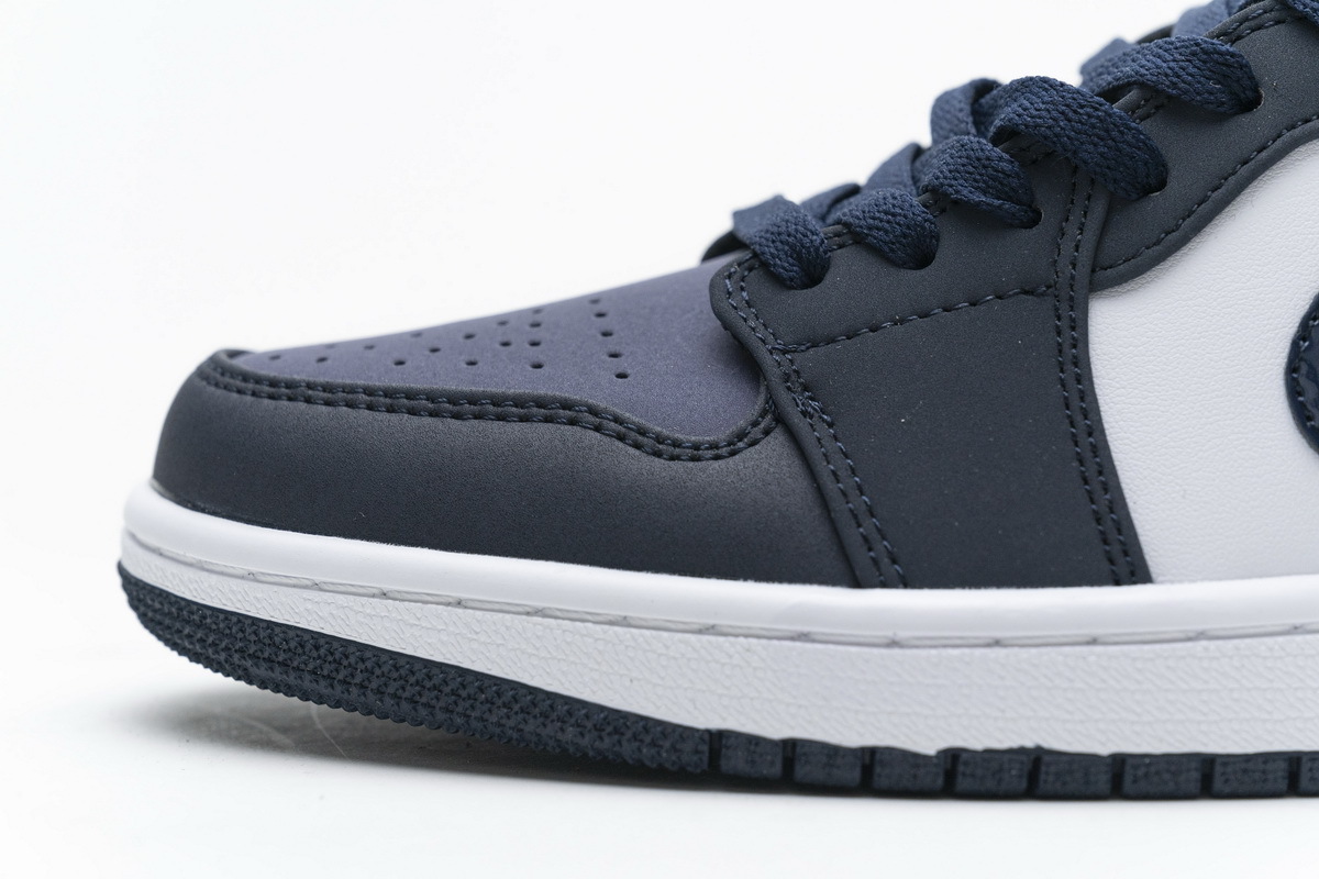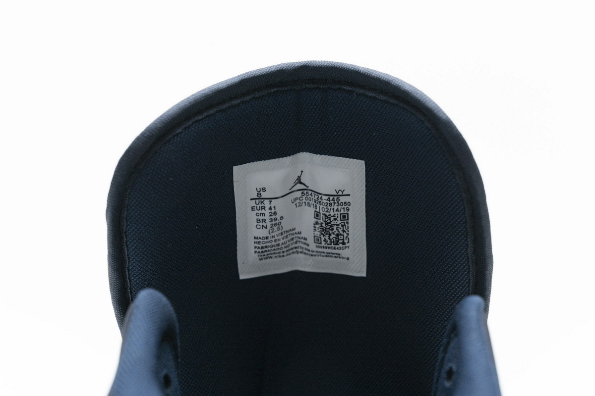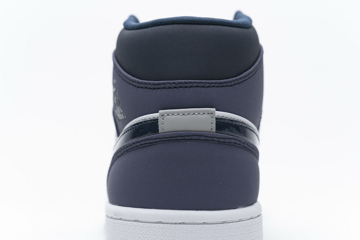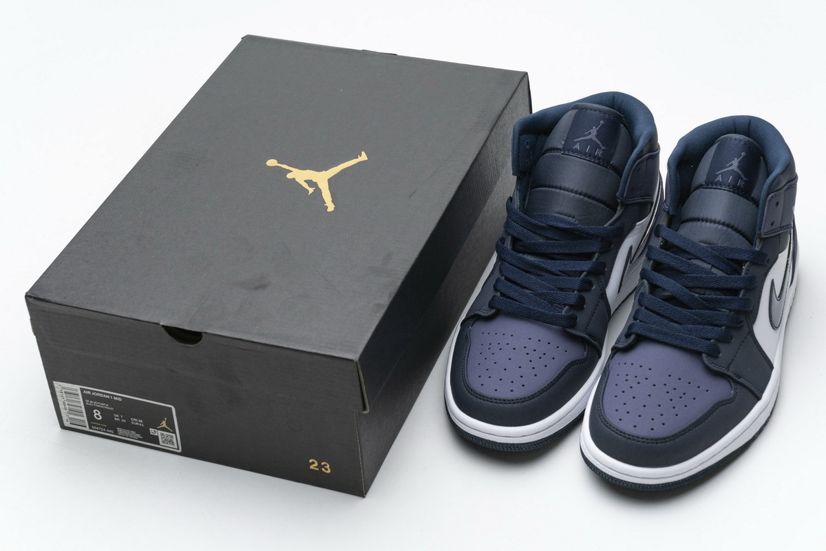 Product description:Dressed in an Obsidian, Sanded Purple, and White color scheme. This mid-top Air Jordan 1 features an Obsidian overlay on the throat, patent leather Swoosh, tongue, and outsole, while White covers the side panels and midsole. Sanded Purple is used on the toe box, collar, and heel to complete the design.