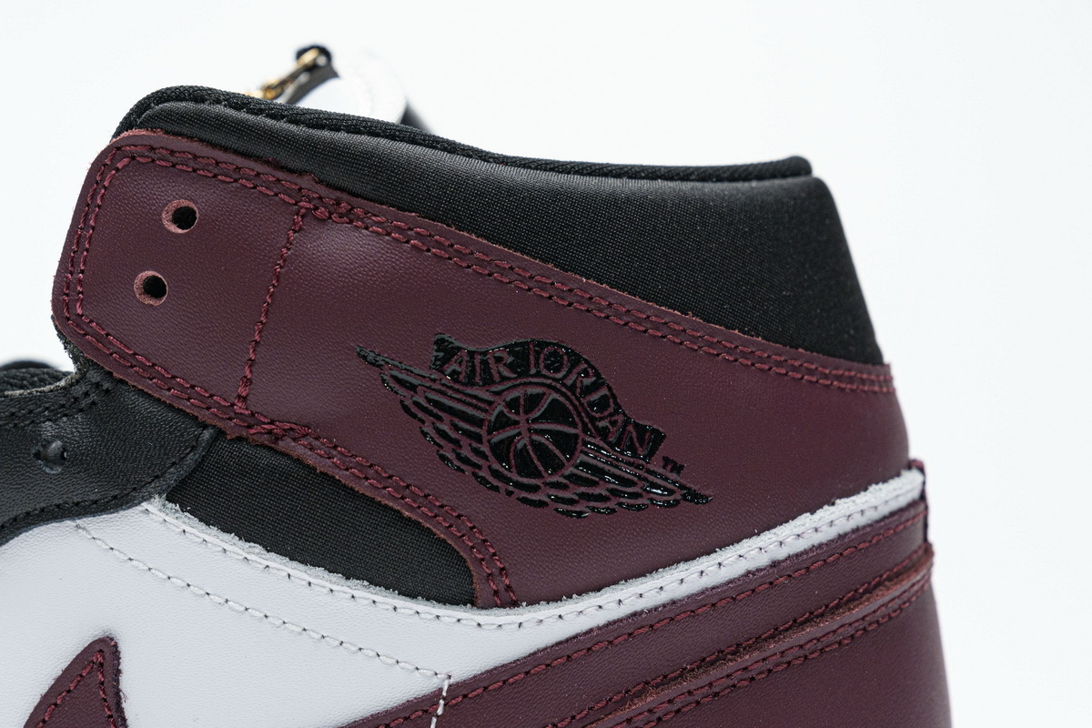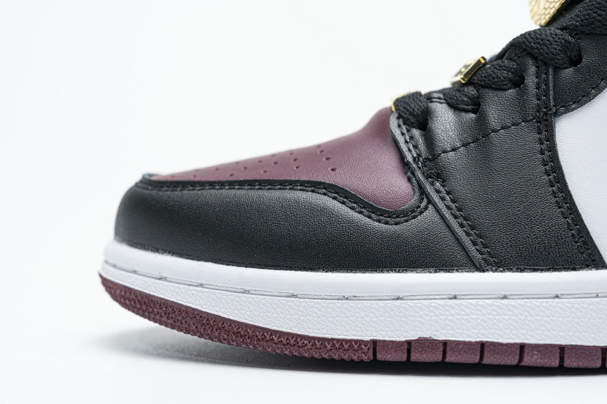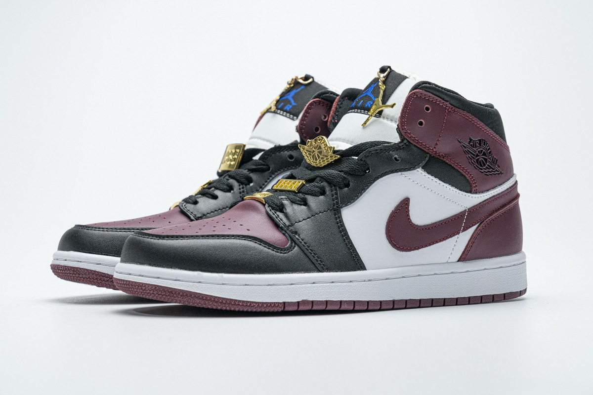 Product description:This offering of the mid-top Air Jordan 1 comes constructed in full leather build featuring White side panels and midsole, Black overlays, and Dark Red toe box, Swooshes, ankle flap, heels and outsole. Blue branding tongues and insoles with four Gold pendants appearing tongues and laces completes the design.