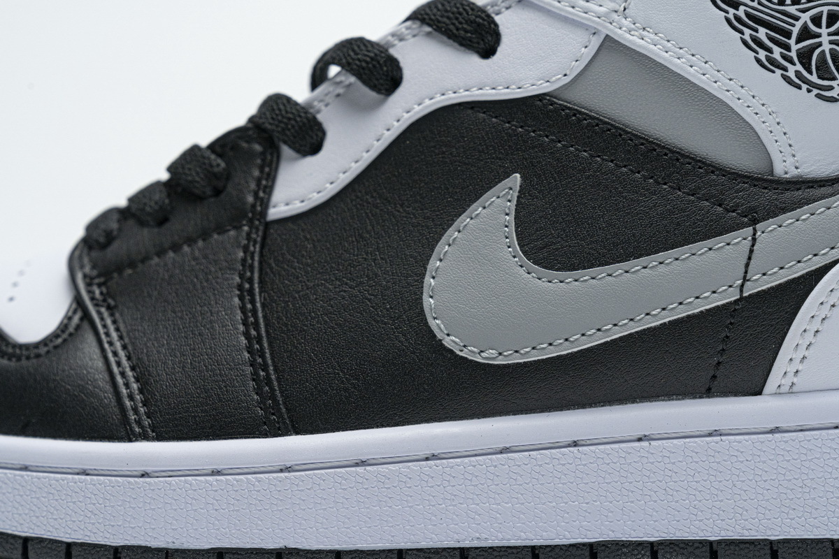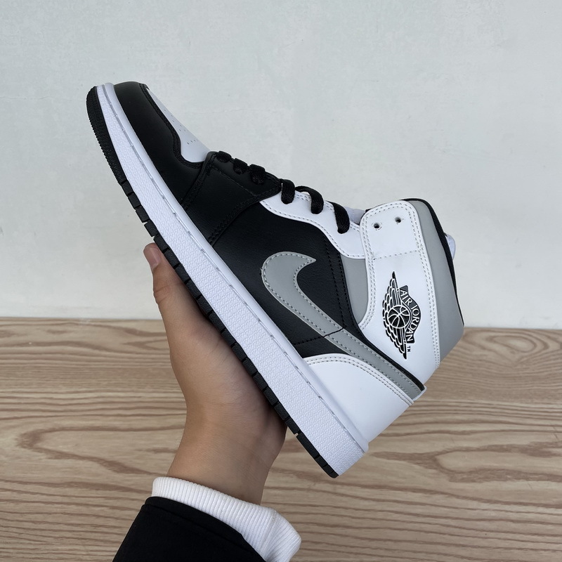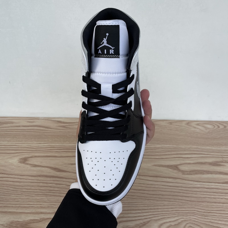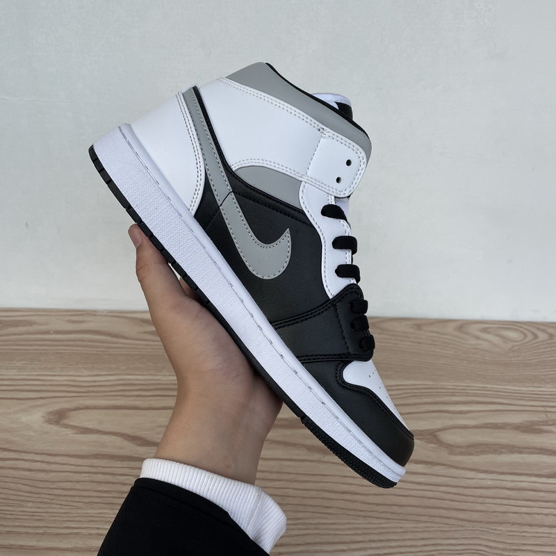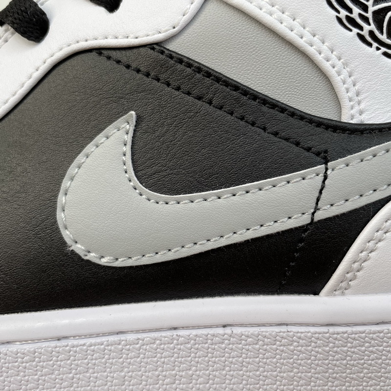 Product description:This “White Shadow” edition of the mid-top Air Jordan 1 features White leather covering the toe and rear overlays with Black on the side panels, forefoot and toe overlay. Finishing details includes Grey Swooshes and ankle collar along with Black laces, liner, tongue tags, Wings logo atop a White midsole and Black rubber outsole.
