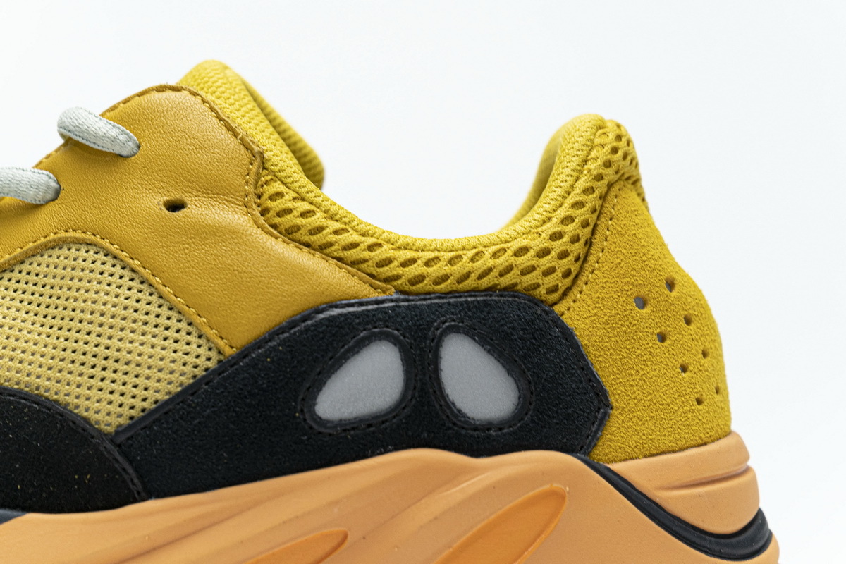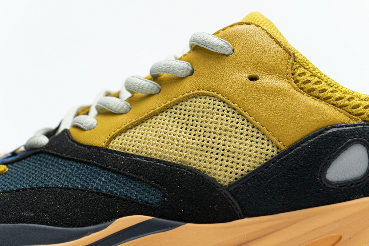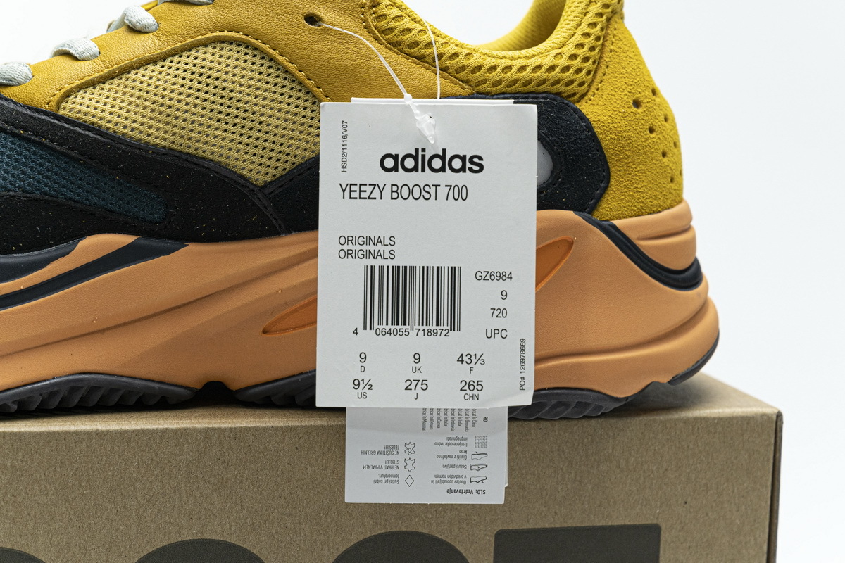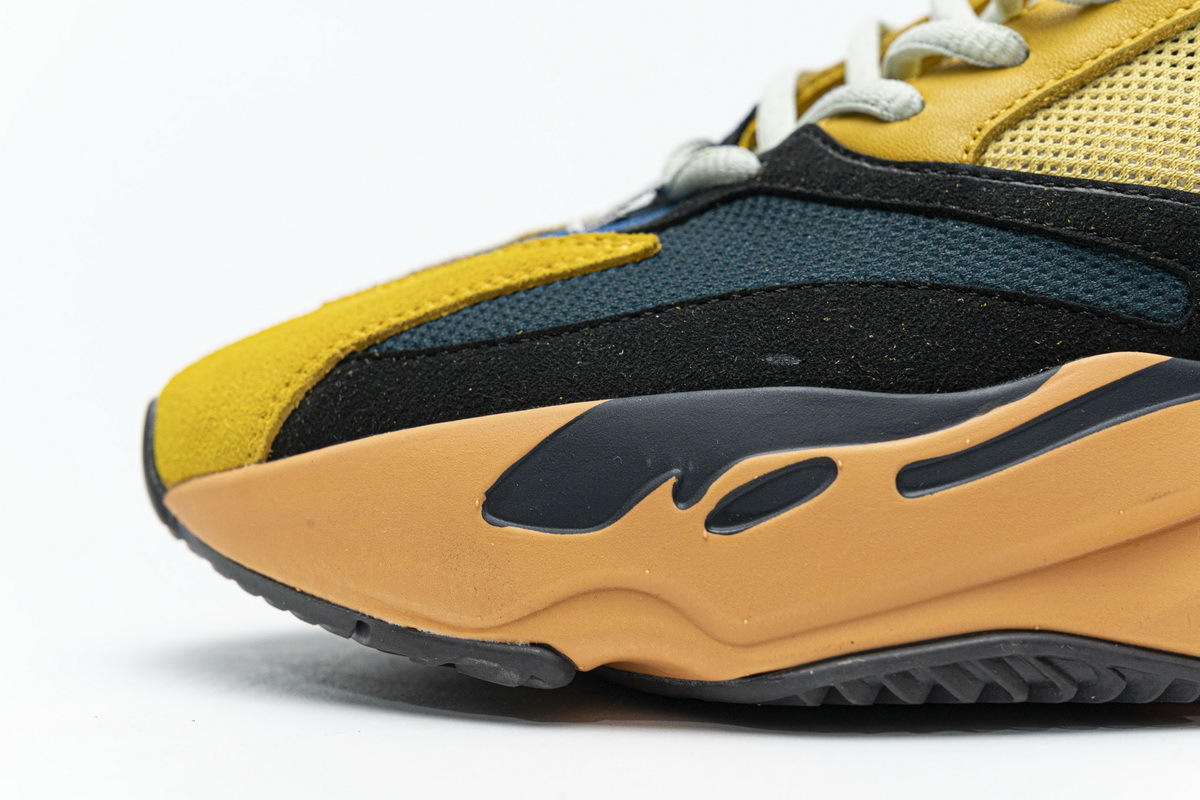Product description: The adidas Yeezy Boost 700 Sun is primarily composed of a bright yellow mesh, leather, and suede upper with back and teal overlays located over the forefoot. 3M detailing on the heel, a bright orange Boost midsole, and a dark grey outsole adds the finishing touches to this vibrant design.
