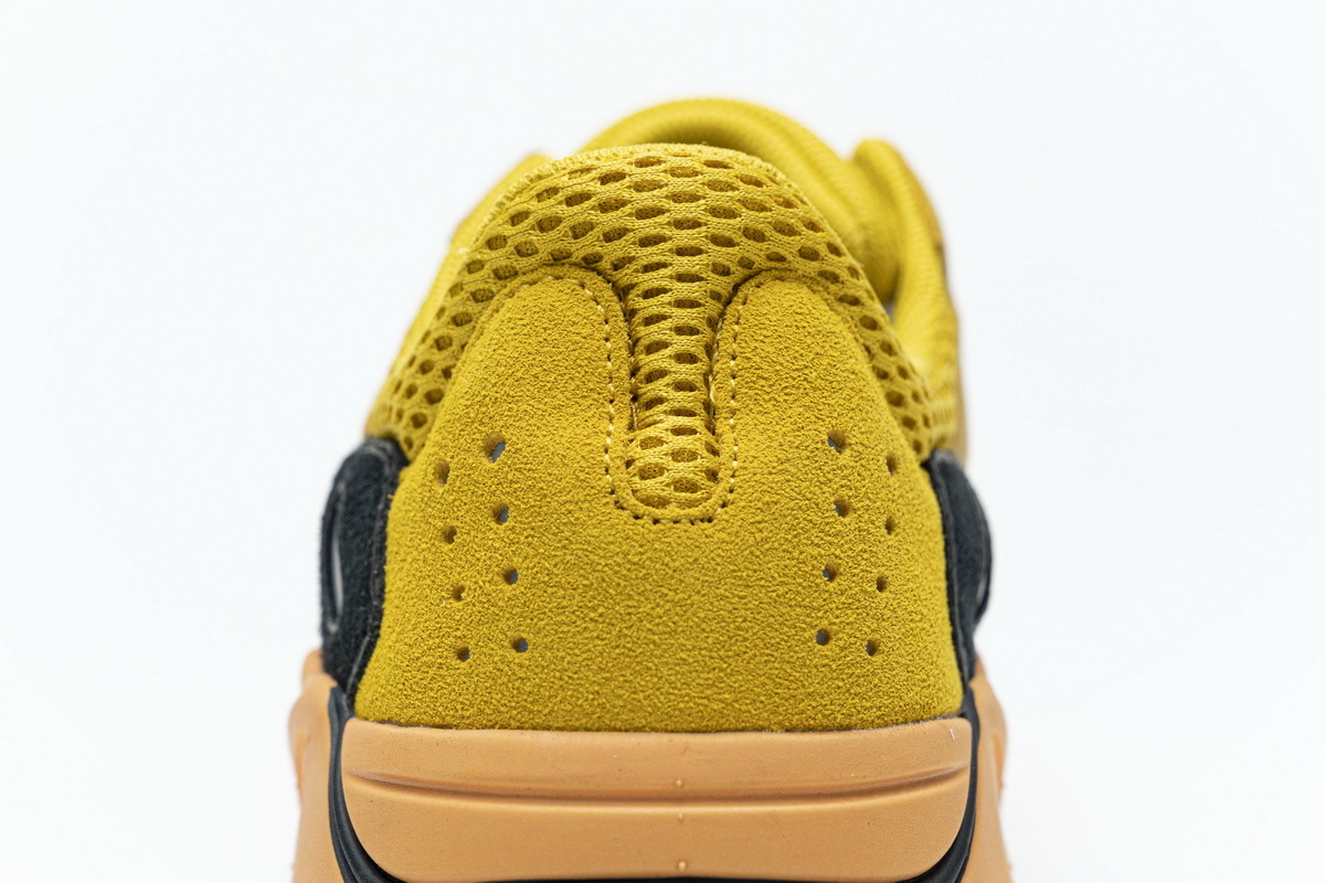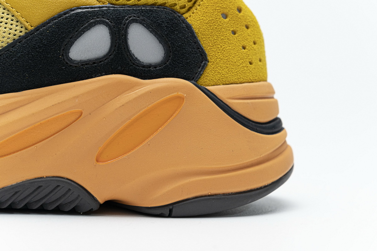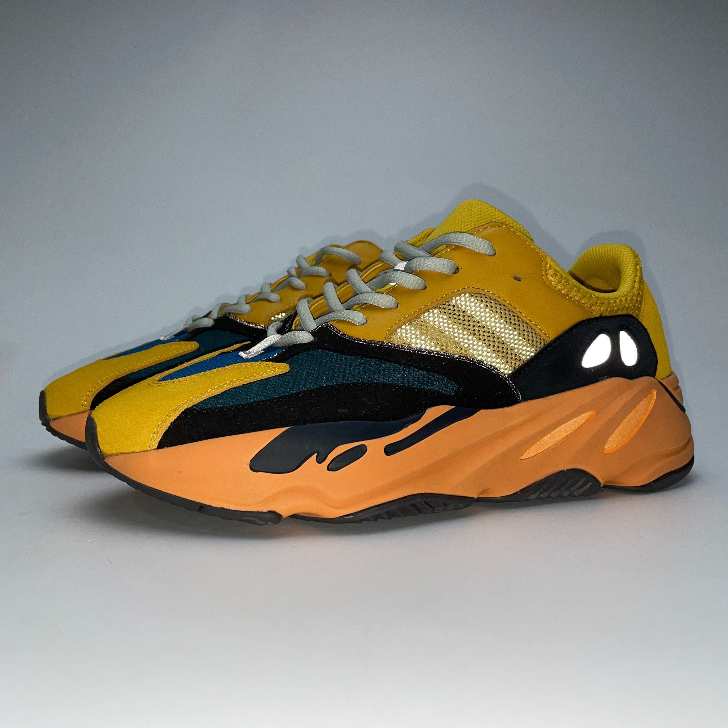 Product description: The adidas Yeezy Boost 700 Sun is primarily composed of a bright yellow mesh, leather, and suede upper with back and teal overlays located over the forefoot. 3M detailing on the heel, a bright orange Boost midsole, and a dark grey outsole adds the finishing touches to this vibrant design.