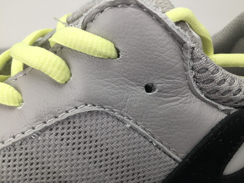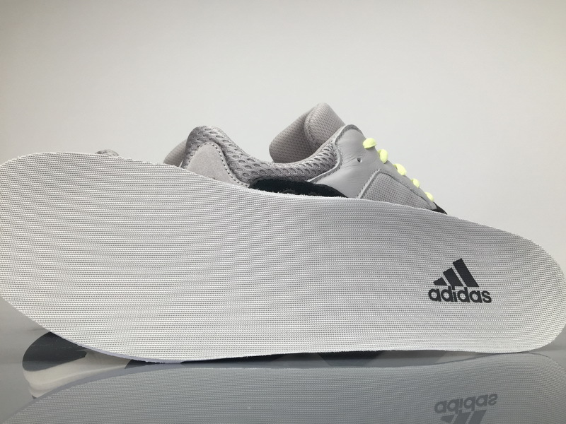 Product description: The shoe features an upper with grey and black suede overlays, premium leather with blue mesh underlays, neon green laces, and its signature chunky midsole with encapsulated Boost technology.