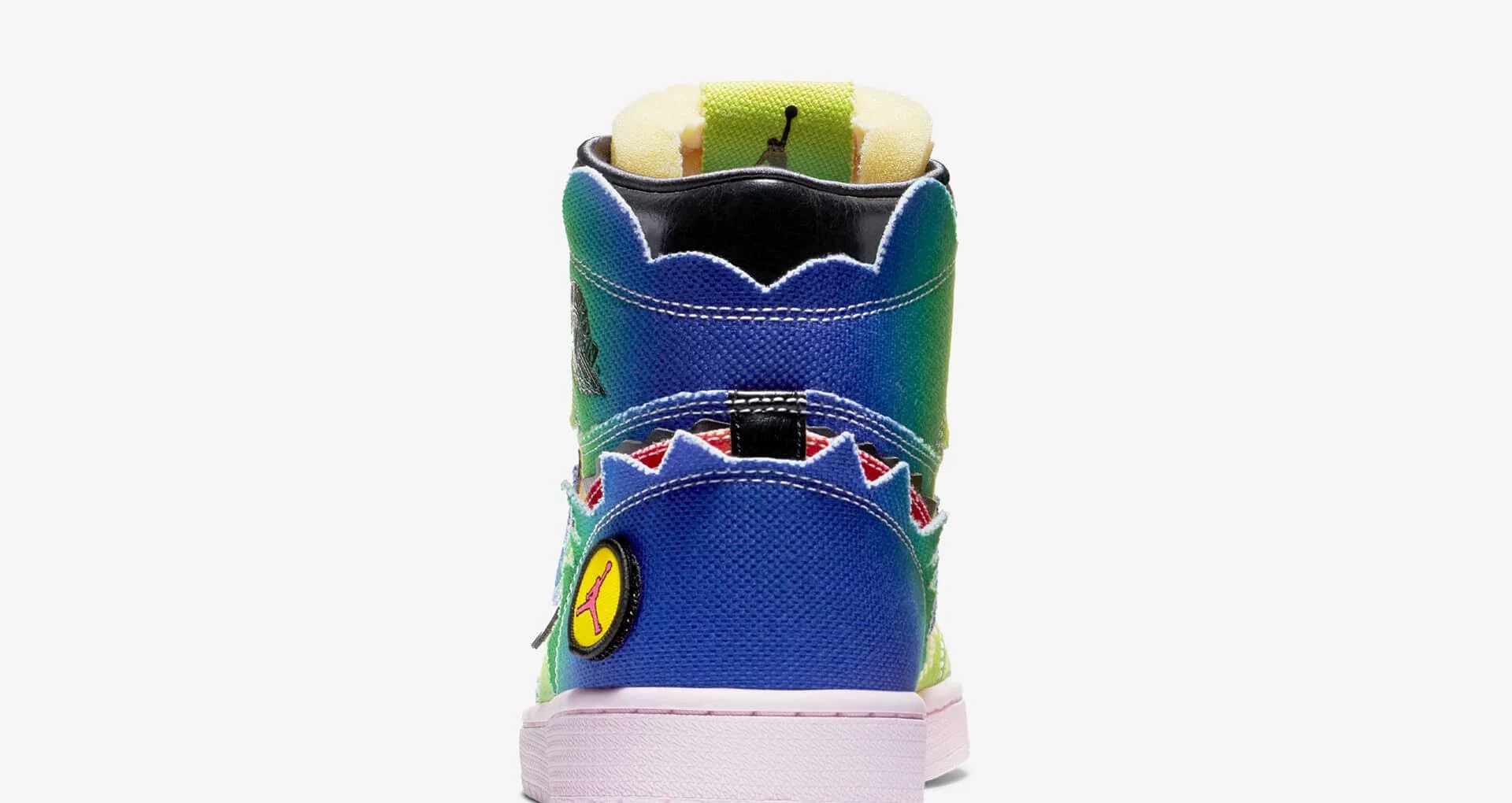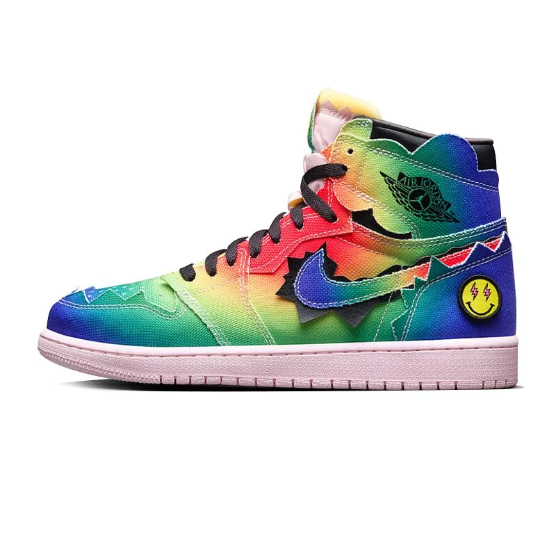 Product description: The Air Jordan 1 High J Balvin features a layered tie-dye canvas upper with designed jagged edges to expose solid black leather patches. Exposed foam tongues give off a vintage feel to the shoe, while velcro patches on the heel depicting Jordan and J Balvin insignia’s provide wearers with the freedom to customize their pair. A light pink sole and J Balvin’s smiley face logo on the tongue and insole add the finishing touches to this one-of-a-kind Jordan 1.