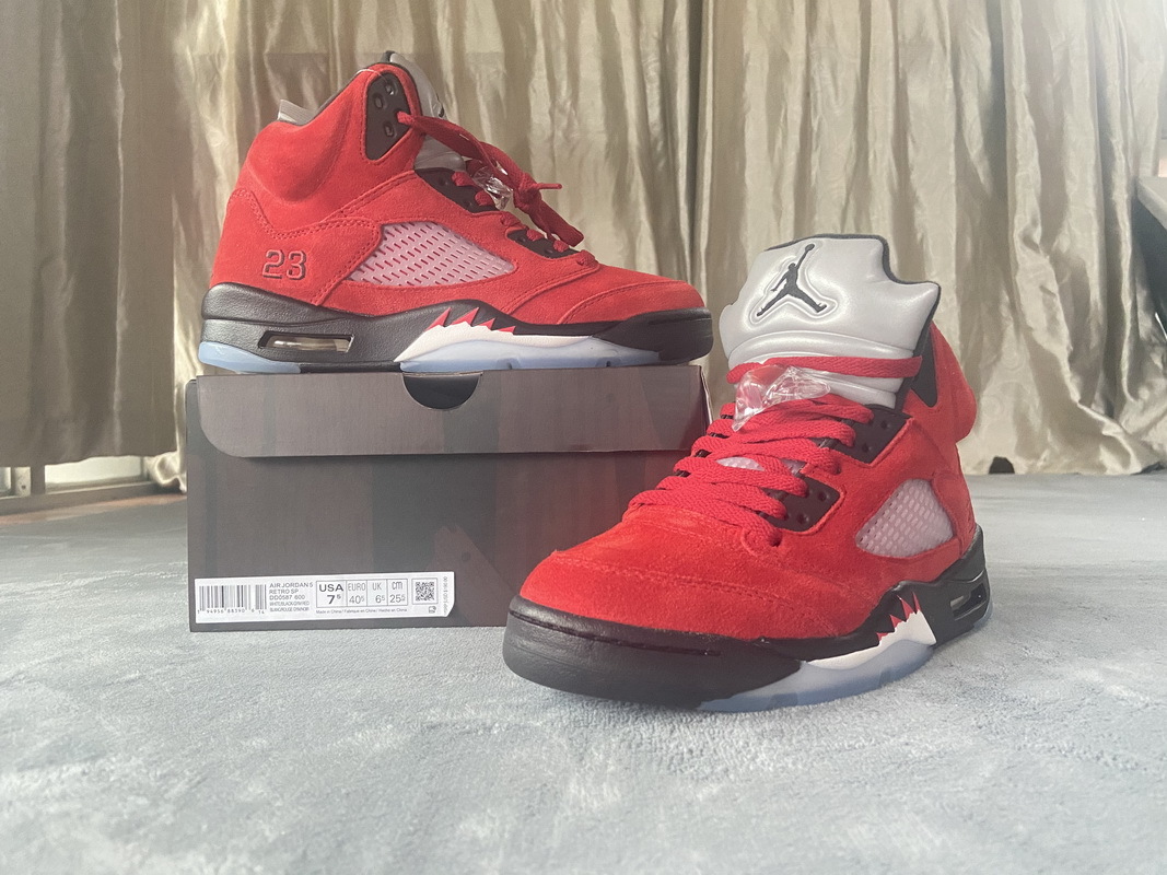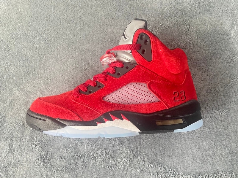 Product description: The Air Jordan 5 Raging Bulls is a suede lover’s dream, bringing back the same look and feel from the 2009 version. The upper is composed entirely out of red suede, celebrating MJ’s tenure with the Chicago Bulls. From there, a red and black embroidered “23” appears on the lateral side of each shoe’s heel, highlighting Jordan’s quintessential jersey number. In usual Jordan 5 fashion, the upper part of the tongue is made of reflective materials with a contrasting black Jumpman logo. Lastly, the model’s World War II fighter jet inspiration is made apparent from the white and red shark tooth details that lay atop a black midsole.
