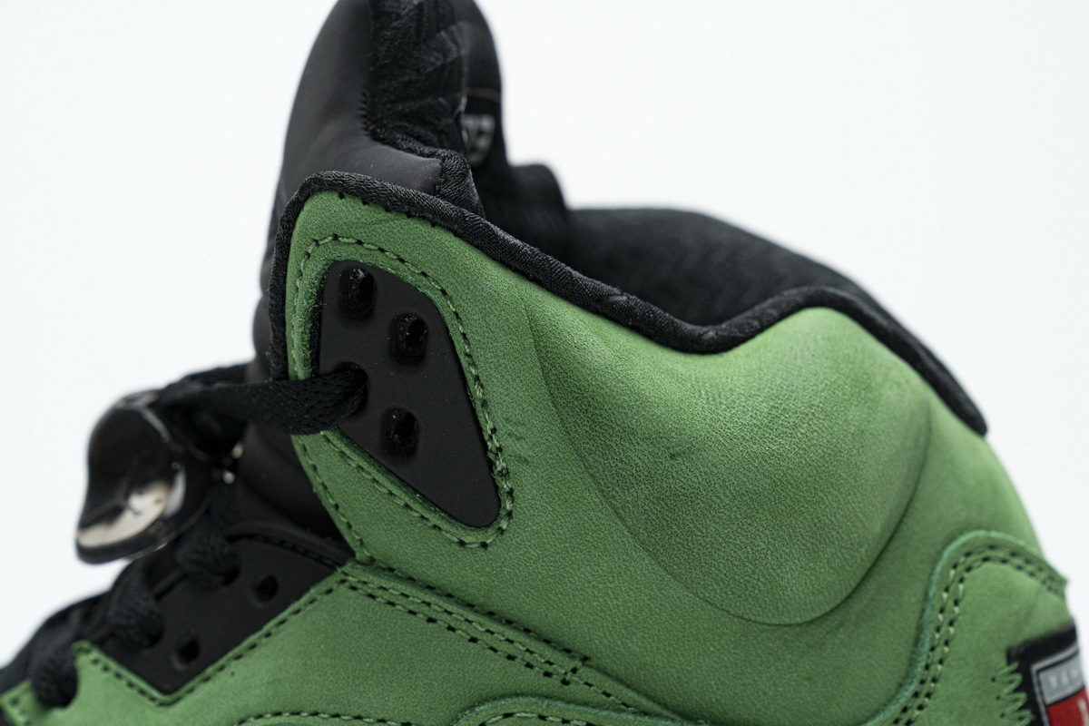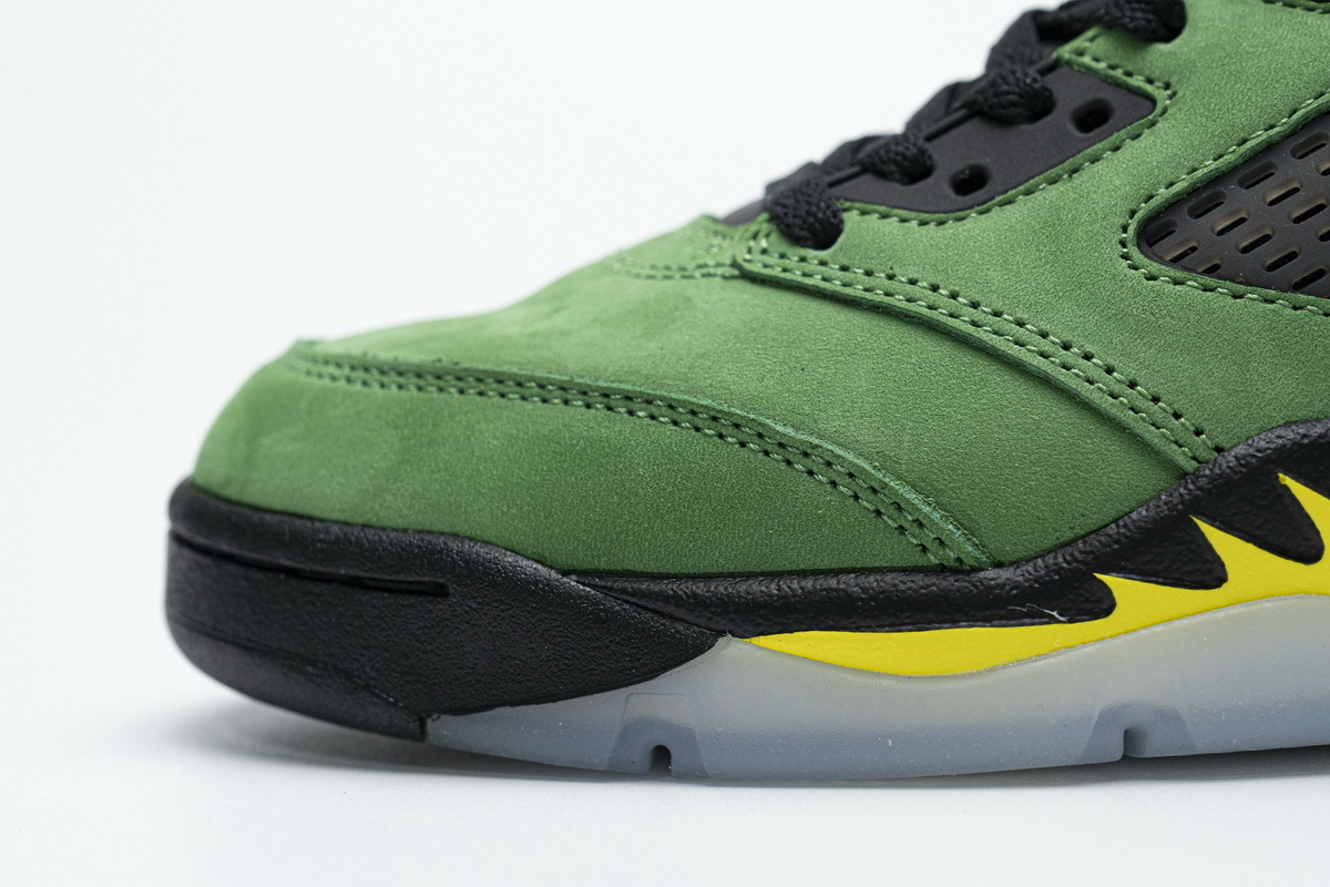 Product description: The Air Jordan 5 Retro SE Oregon colorway draws inspiration from a Jordan 5 PE that was gifted to Oregon student-athletes in 2014. The sneaker’s upper is smothered in Apple Green Durabuck with hits of yellow and black. Unlike the PE version, Oregon branding is replaced with traditional Jumpman on the tongue and a Team Jordan tag heel, similar to last year’s Jordan 5 Michigan release. A black midsole and icy translucent outsole completes this collegiate masterpiece.