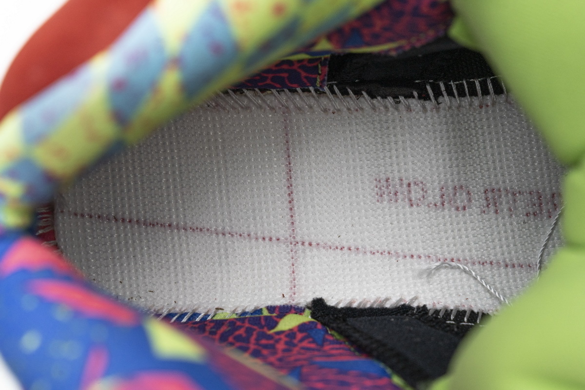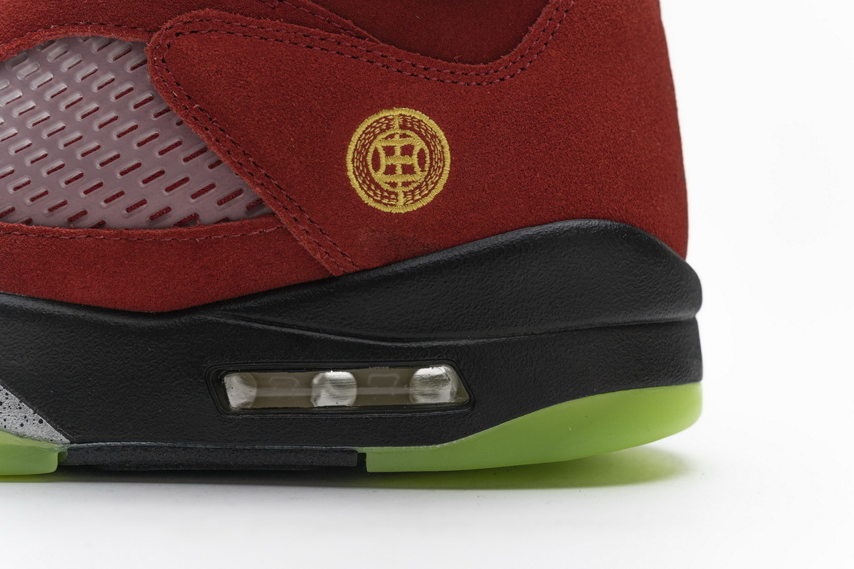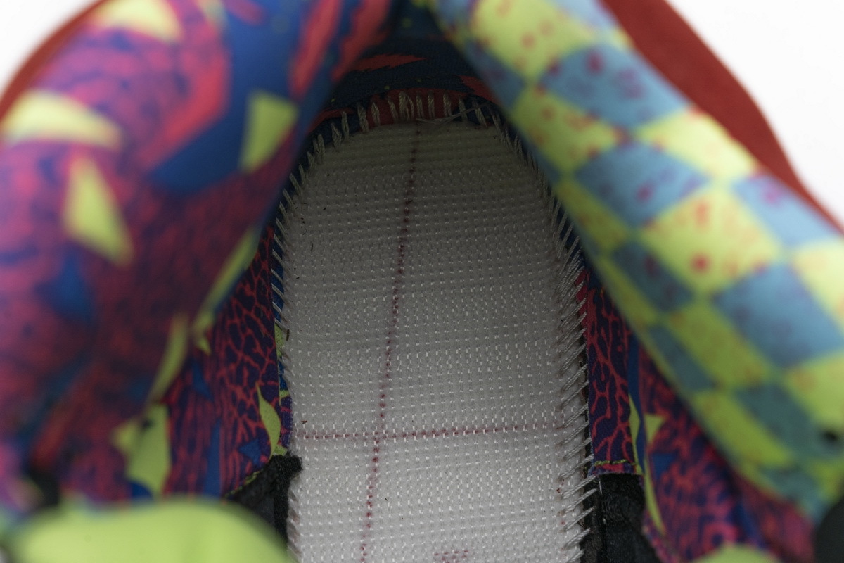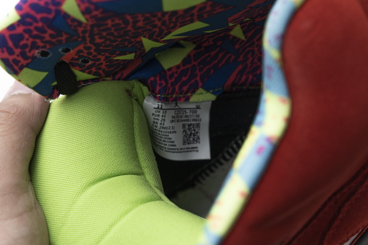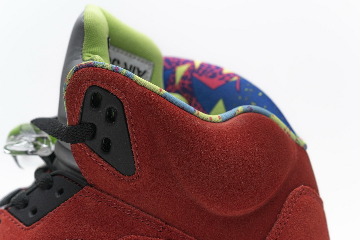 Product description: In true mismatched fashion, each foot of the Air Jordan 5 What The showcases a different look. On the right, yellow suede from the Tokyo 5 smothers the upper atop a purple and blue speckled Belair 5 midsole with a patterned interior pulled from the Jordan 5 Olive. On the left, red suede tributing the Raging Bull Jordan 5 covers the upper atop a black, grey, and lime green sole that references the Quai 54 iteration. Heel embroidery nodding to the Shanghai and Tokyo models, icy translucent outsoles, and 3M reflective tongues complete this scrambled iteration.