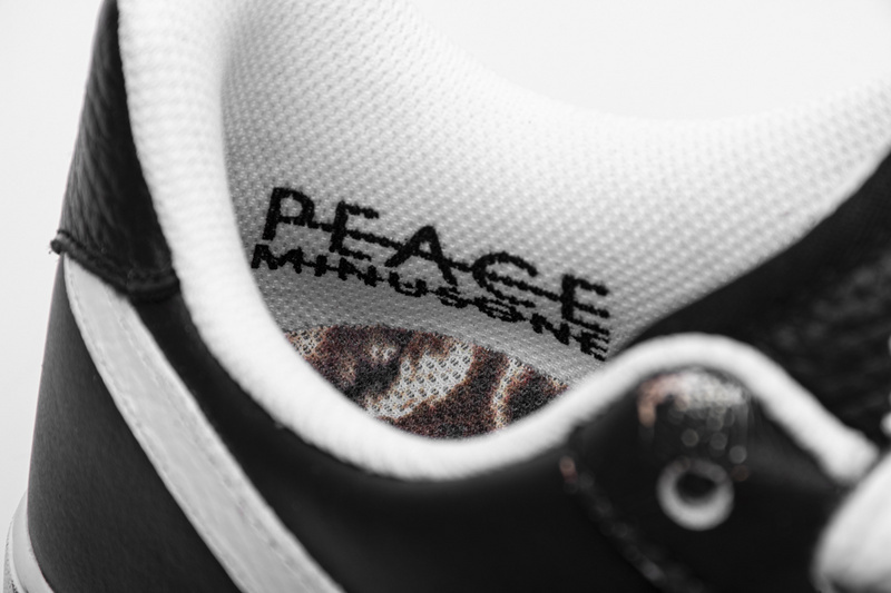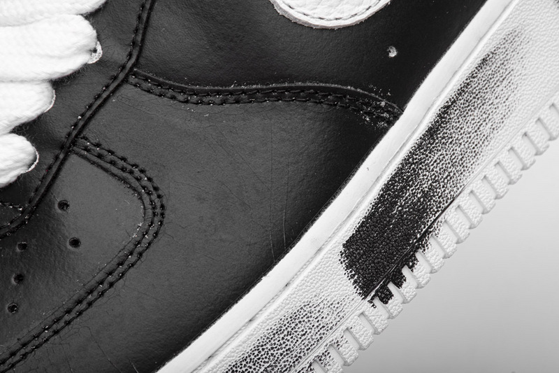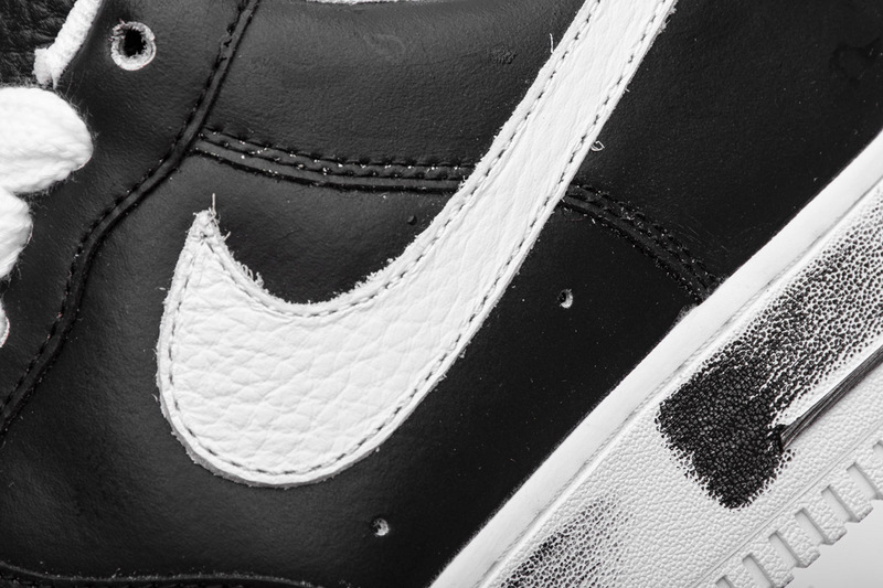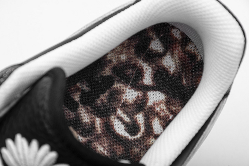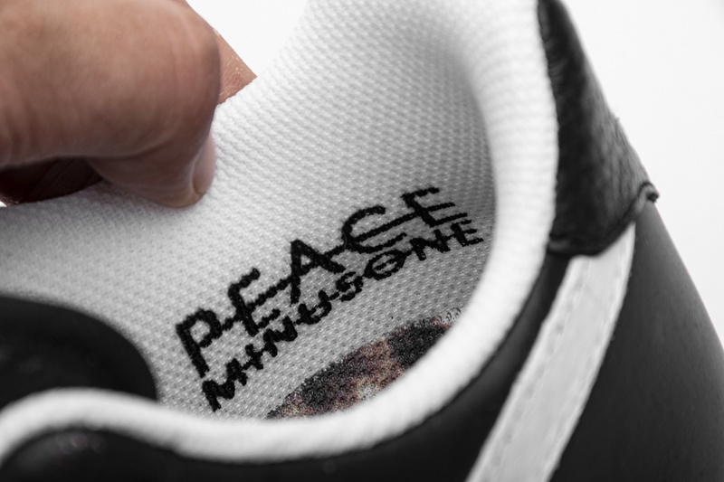 Product description: This AF-1 features a black upper treated with a special lacquer coating that will rub off over time, revealing G-Dragon’s hidden artwork. The PEACEMINUSONE Daisy motif is embroidered on the tongue and is accompanied by applied black paint streaks on the sides, back, and bottom of the white sole. White overlays, detailing, and laces complete the design.