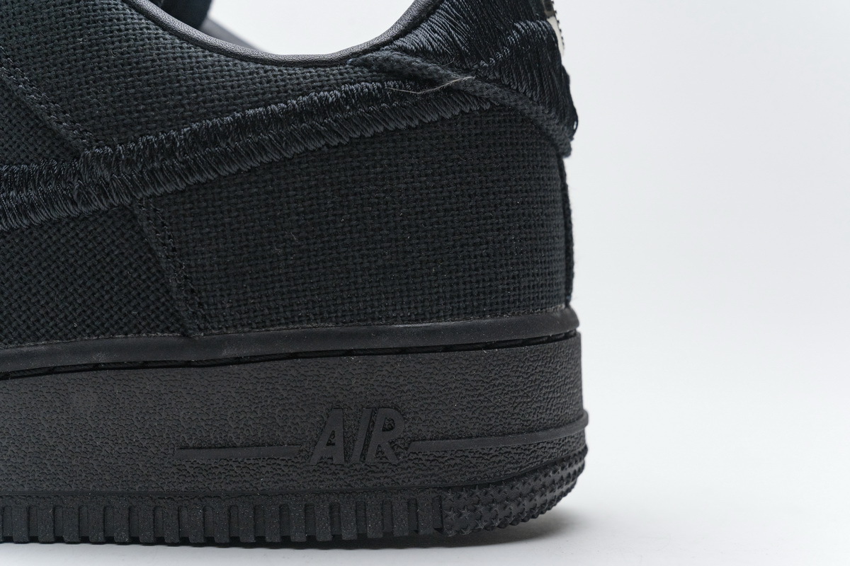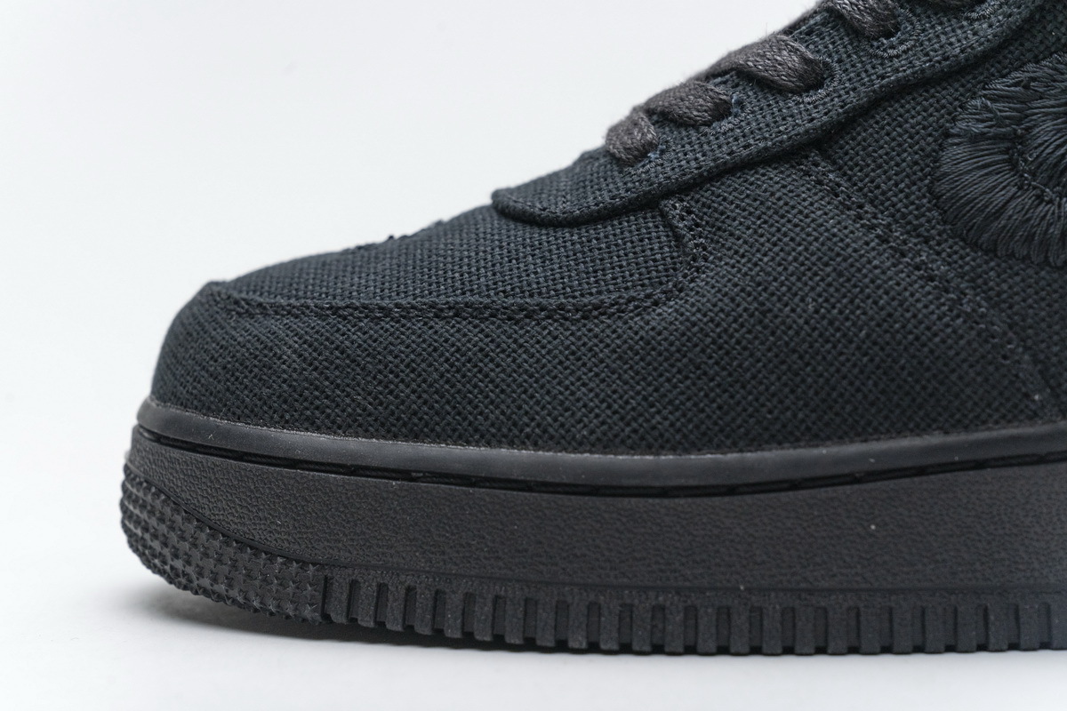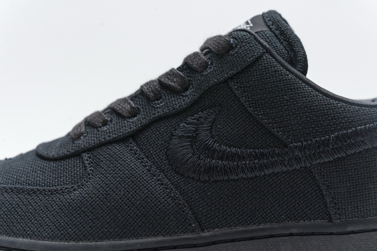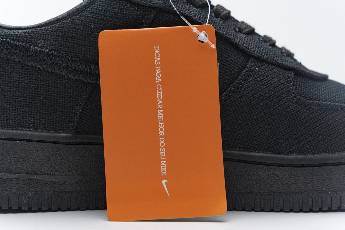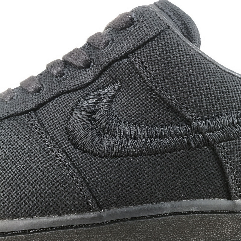 Product description: The Nike Air Force 1 Low Stüssy Black features a hemp-like woven upper with heavily embroidered Swooshes and an alternate, long-haired textile on the heel tabs. Leather interiors, dual-branded tongue tags, and a Stüssy double “S” logo embroidered on the toe box finalize this re-iterated classic.