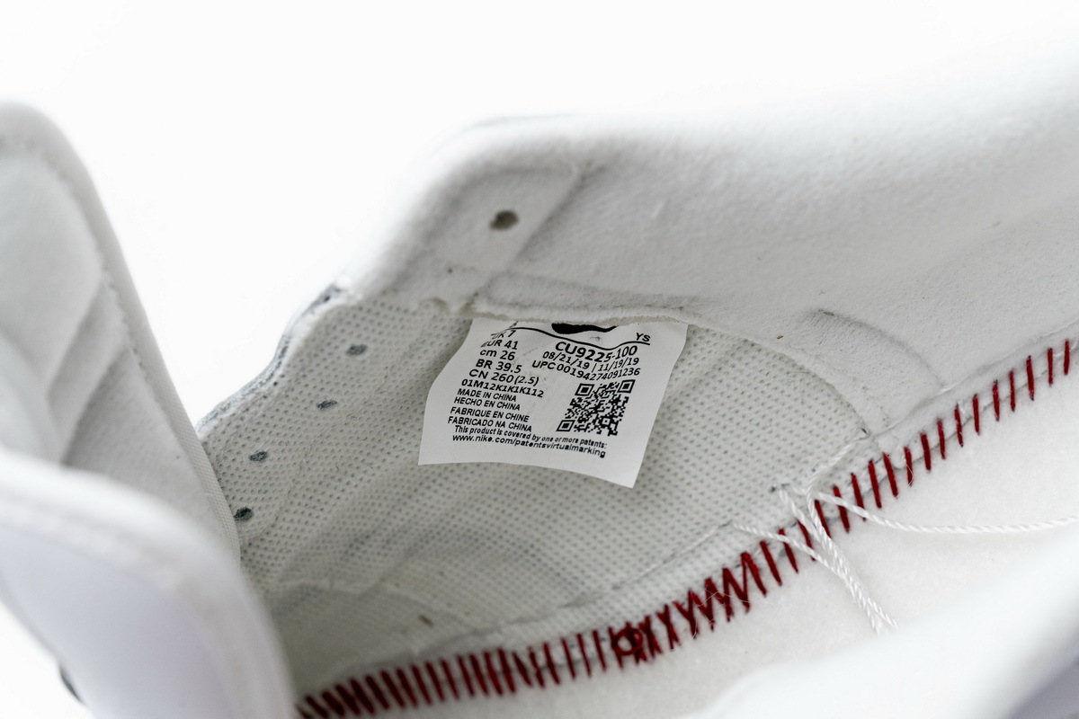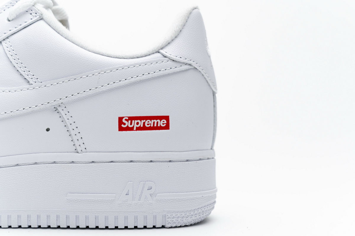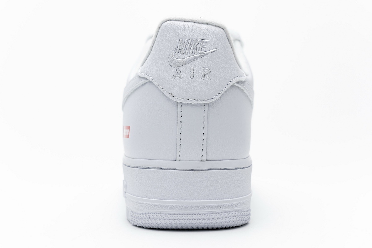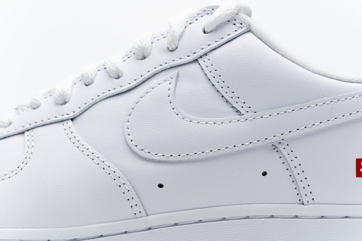 Product description: This Air Force 1 Low is comprised of an all-white leather upper with matching soles and detailing. A red Supreme Box Logo placed on the outside heel and alternate red branded 3M laces complete the design.